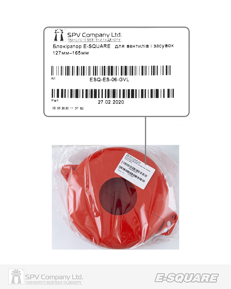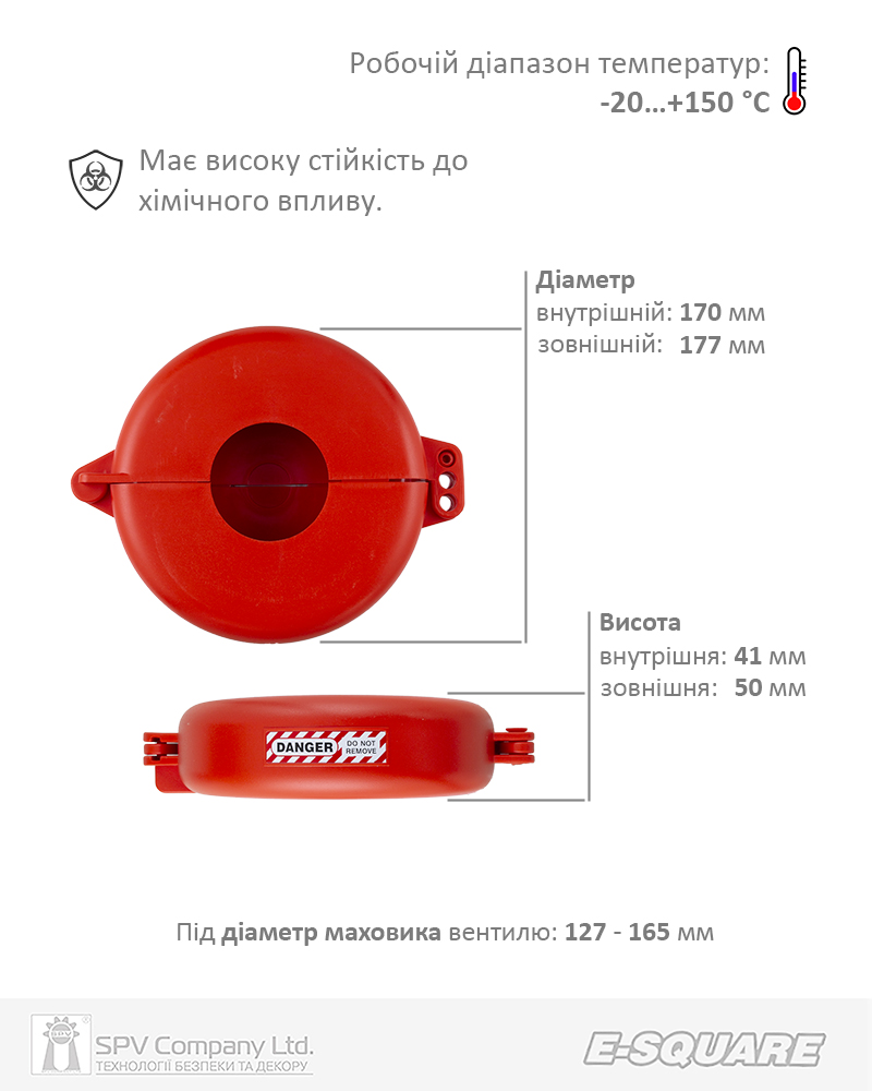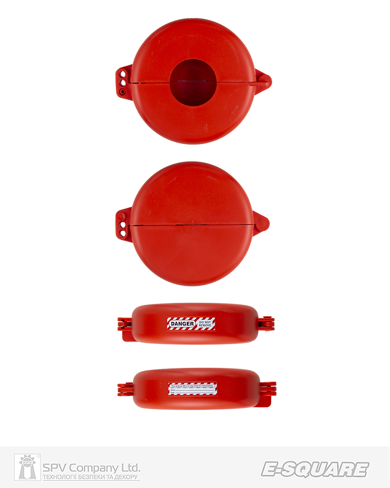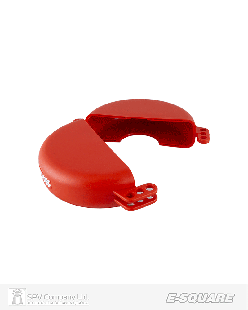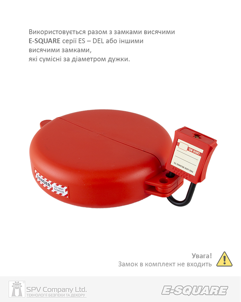 Використається для блокування вентилів та засувок різних діаметрів, в тому числі й з висувним штоком. При встановленні на вентиль вільно обертається та унеможливлює його використання. Має високу стійкість до хімічного впливу. Використається разом з замками висячими E-SQUARE серії ES – DEL або іншими висячими замками, які сумісні за діаметром дужки.