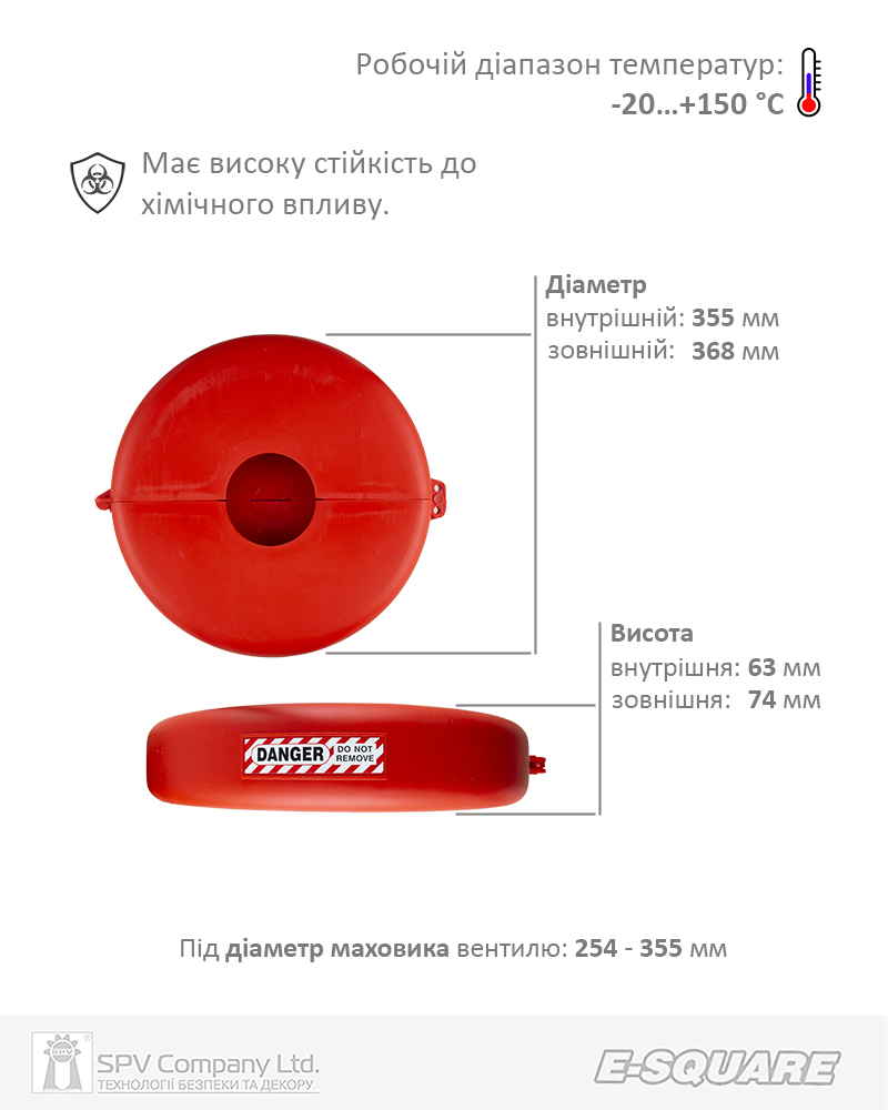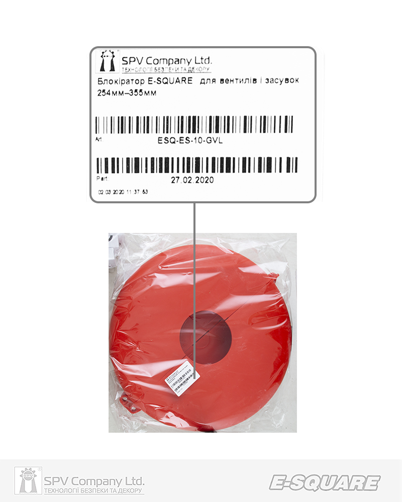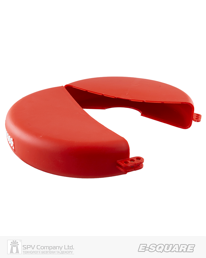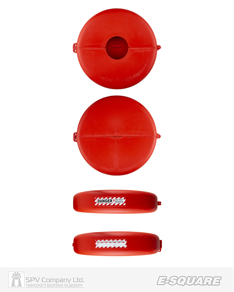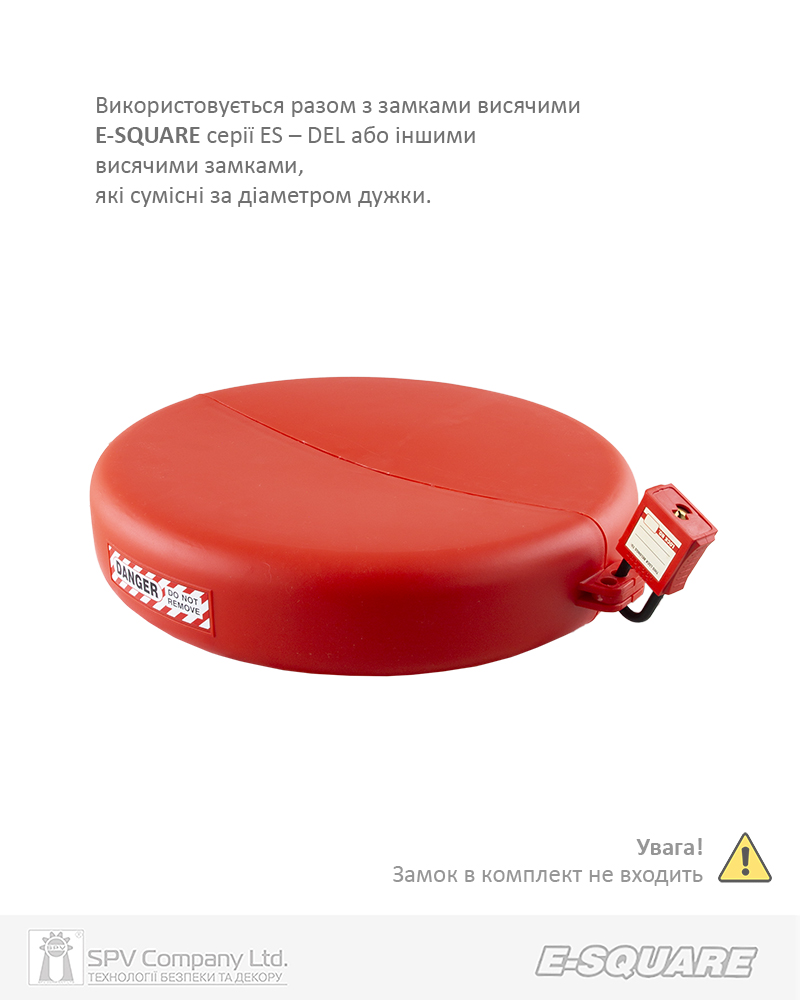 Використається для блокування вентилів та засувок різних діаметрів, в тому числі й з висувним штоком. При встановленні на вентиль вільно обертається та унеможливлює його використання. Має високу стійкість до хімічного впливу. Використається разом з замками висячими E-SQUARE серії ES – DEL або іншими висячими замками, які сумісні за діаметром дужки.