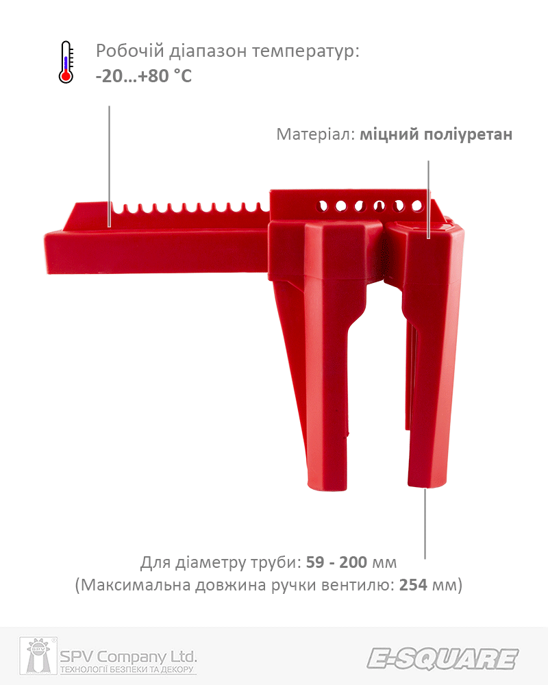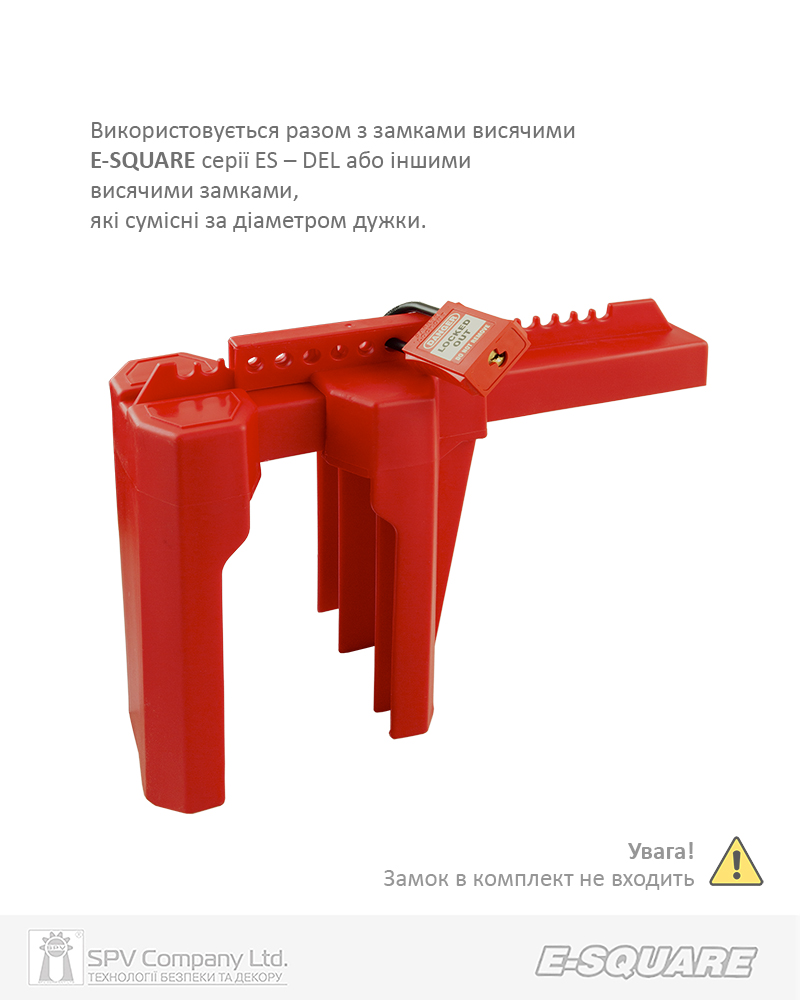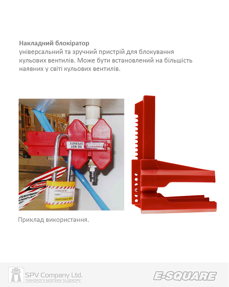 Накладний блокіратор – універсальний та зручний пристрій для блокування кульових вентилів. Може бути встановлений на більшість наявних у світі кульових вентилів. Виготовлений з діелектричного матеріалу, стійкий до механічних пошкоджень. Використається разом з замками висячими E-SQUARE серії ES – DEL або іншими висячими замками, які сумісні за діаметром дужки. Можливе блокування вентилю у зачиненому або відчиненому положенні.