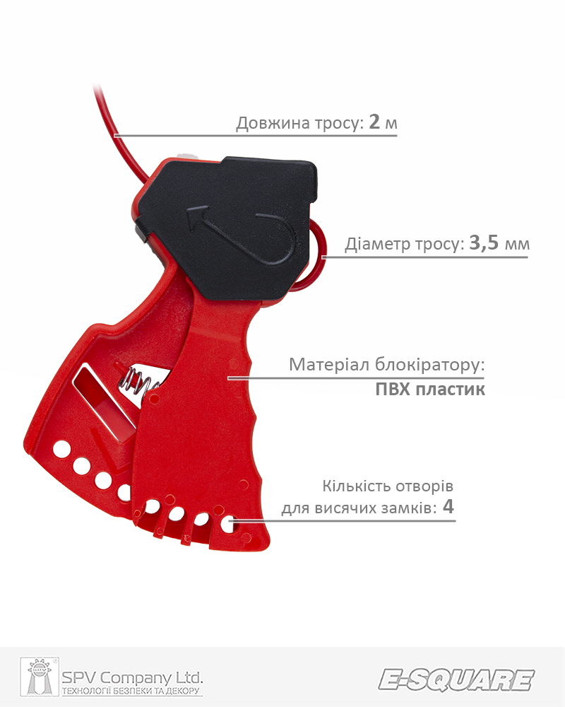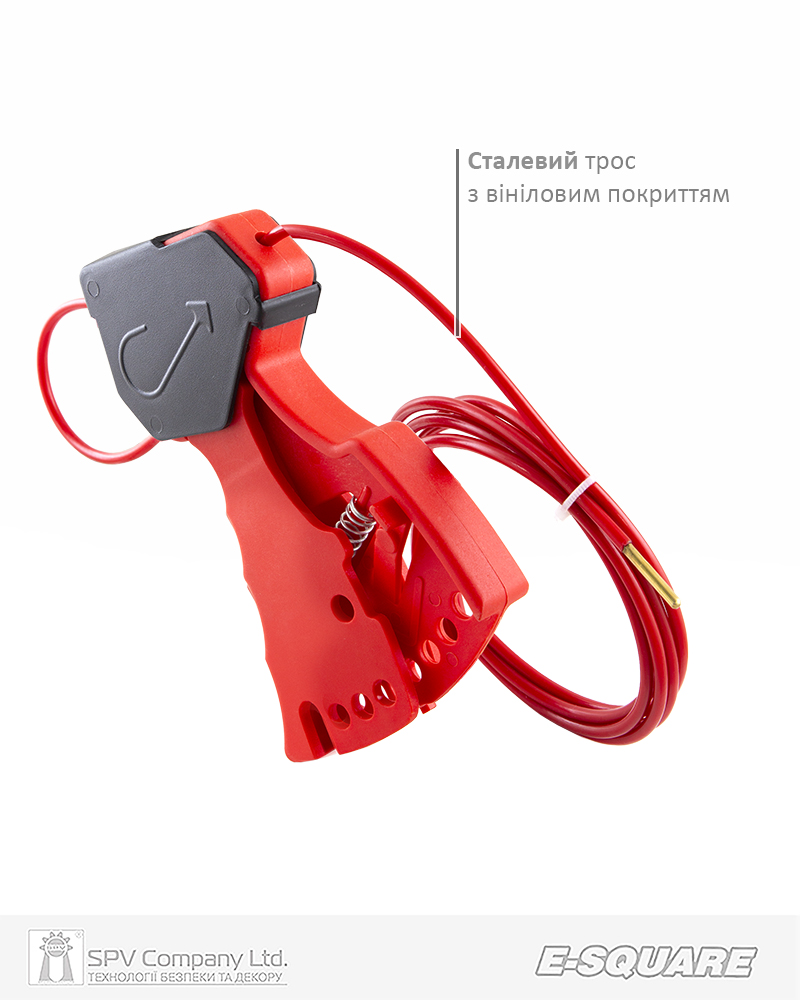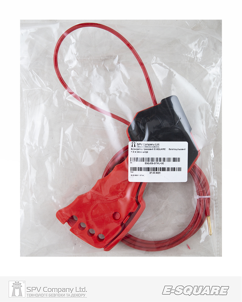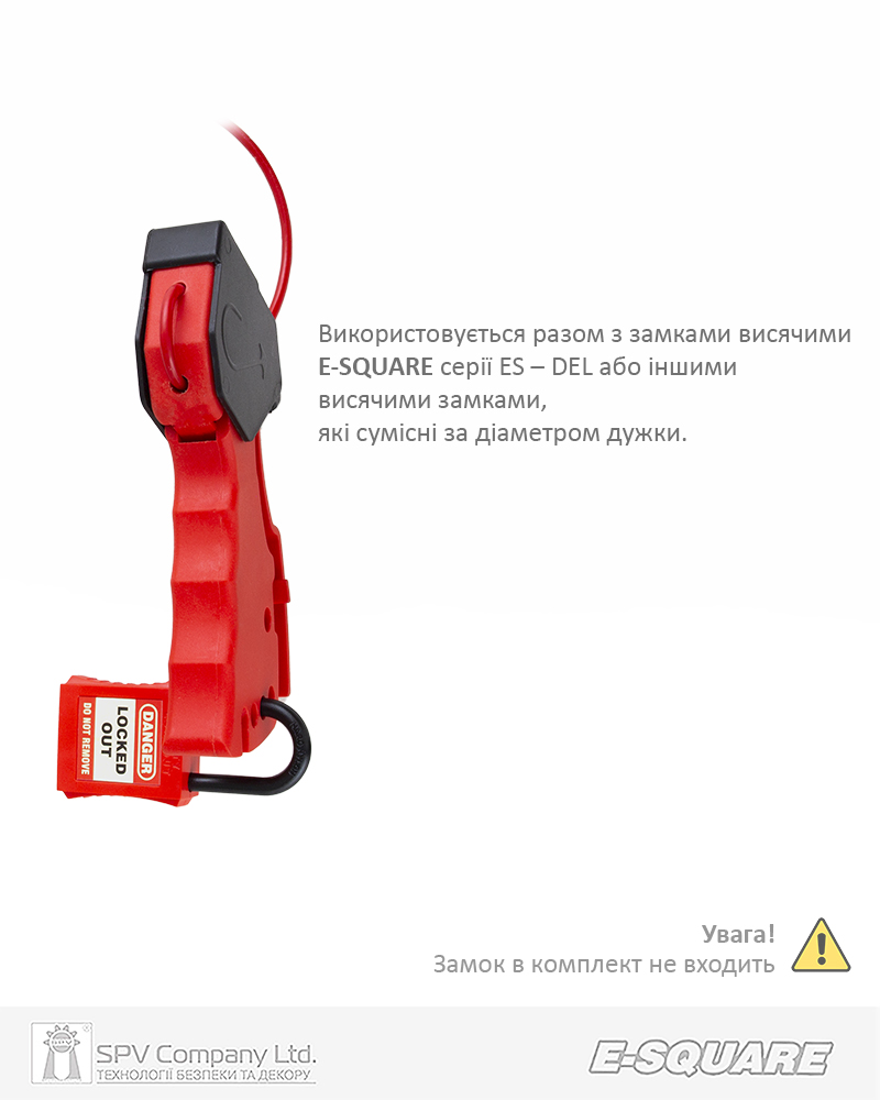 Універсальний діелектричний багатоцільовий пристрій для бокування засувок, вентилів тощо. Є ідеальним рішенням у випадках, коли необхідно заблокувати кілька точок одночасно або коли неможливо використання спеціалізованих блокіраторів. Комплектується сталевим тросом в вініловій оболонці. Використається разом з замками висячими E-SQUARE серії ES – DEL або іншими висячими замками, які сумісні за діаметром дужки.