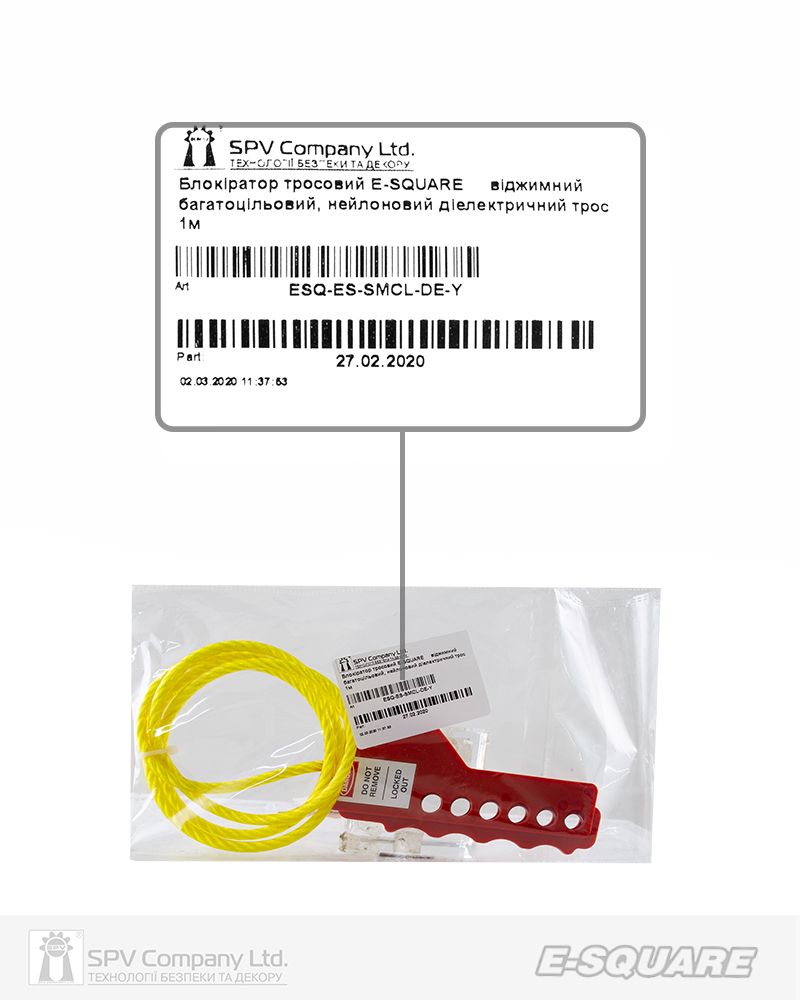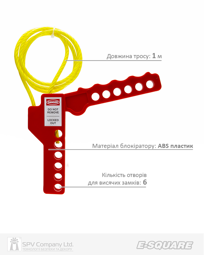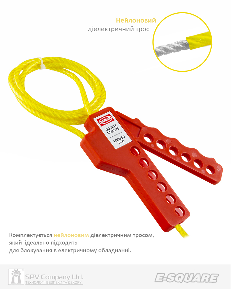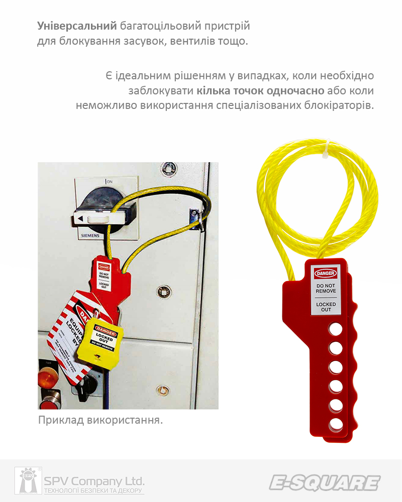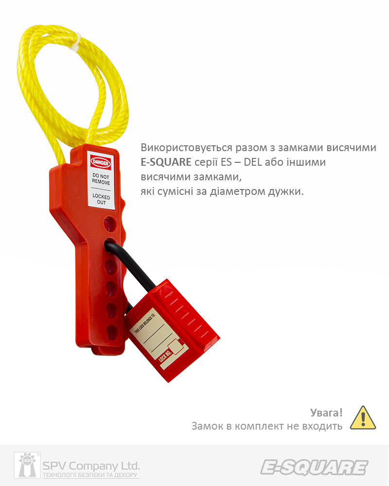 Універсальний багатоцільовий пристрій для бокування засувок, вентилів тощо. Є ідеальним рішенням у випадках, коли необхідно заблокувати кілька точок одночасно або коли неможливо використання спеціалізованих блокіраторів. Комплектується нейлоновим діелектричним тросом, який ідеально підходить для блокування в електричному обладнанні. Використається разом з замками висячими E-SQUARE серії ES – DEL або іншими висячими замками, які сумісні за діаметром дужки.