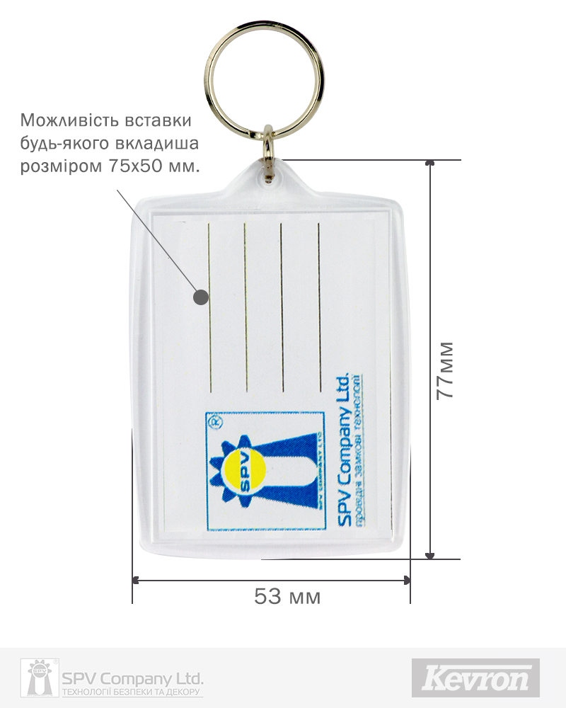 Брелоки Kevron вироблені з високоякісного пластику та надають можливість персоніфікації за допомогою паперової вставки з будь-якою надрукованою інформацією.