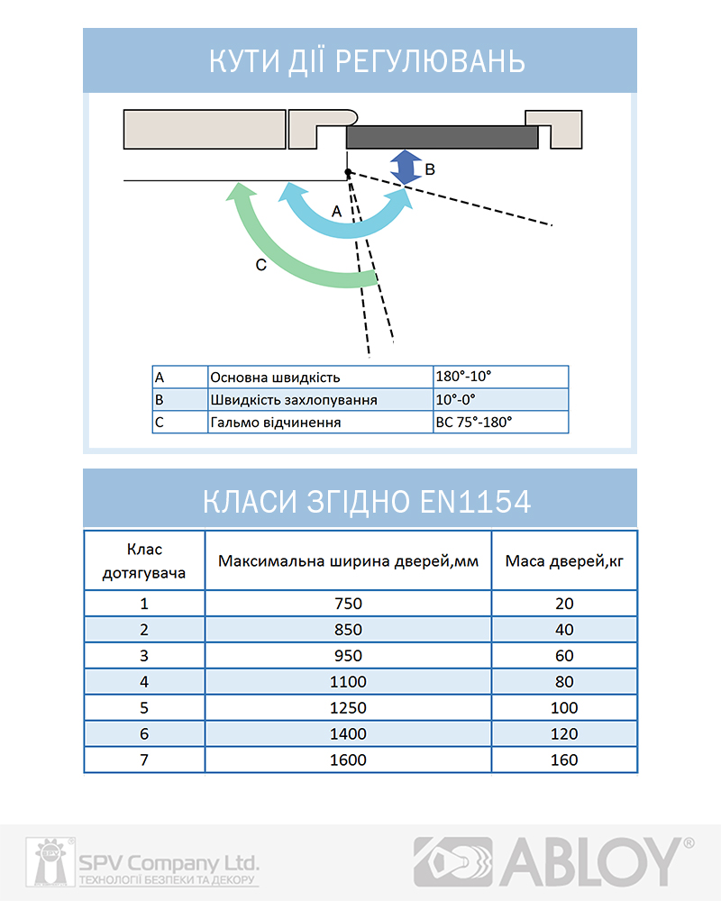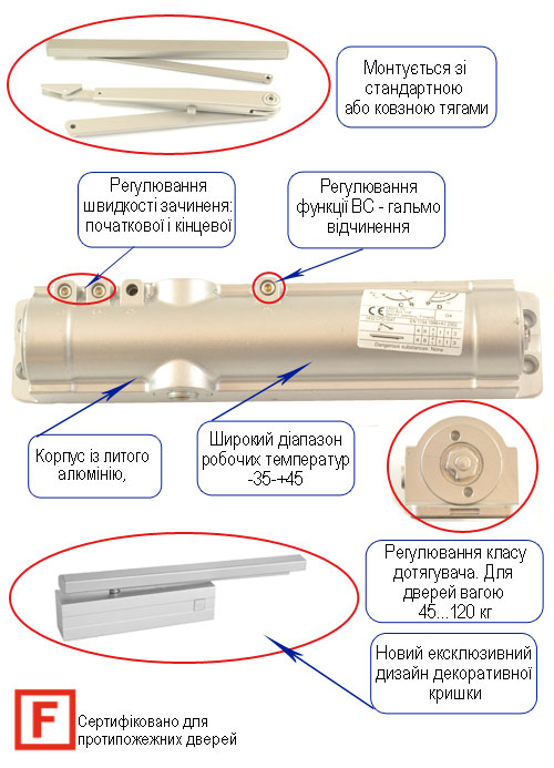 Можливість застосування у протипожежних дверях з межею вогнестійкості 60хв. без фіксатора відкритого положення дверей. Сертифікований згідно до EN 1154.