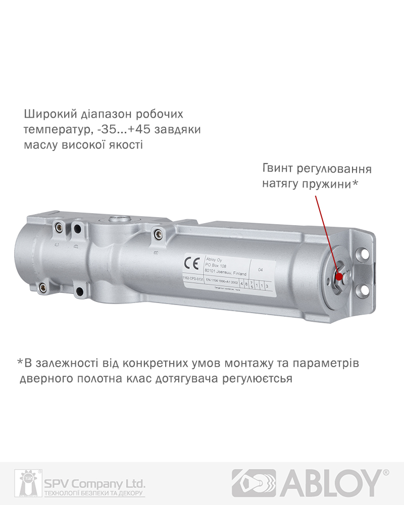Має регулювання натягу внутрішньої пружини (класу дотягувача), що дозволяє використовувати єдину модель дотягувача до різних класів дверей. Також полегшує регулювання сили закривання дотягувача, не змінюючи його положення на дверях.
