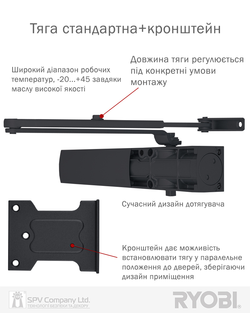 Комплектація: дотягувач, комплект кріплення, тяга стандартна, кронштейн паралельної тяги.