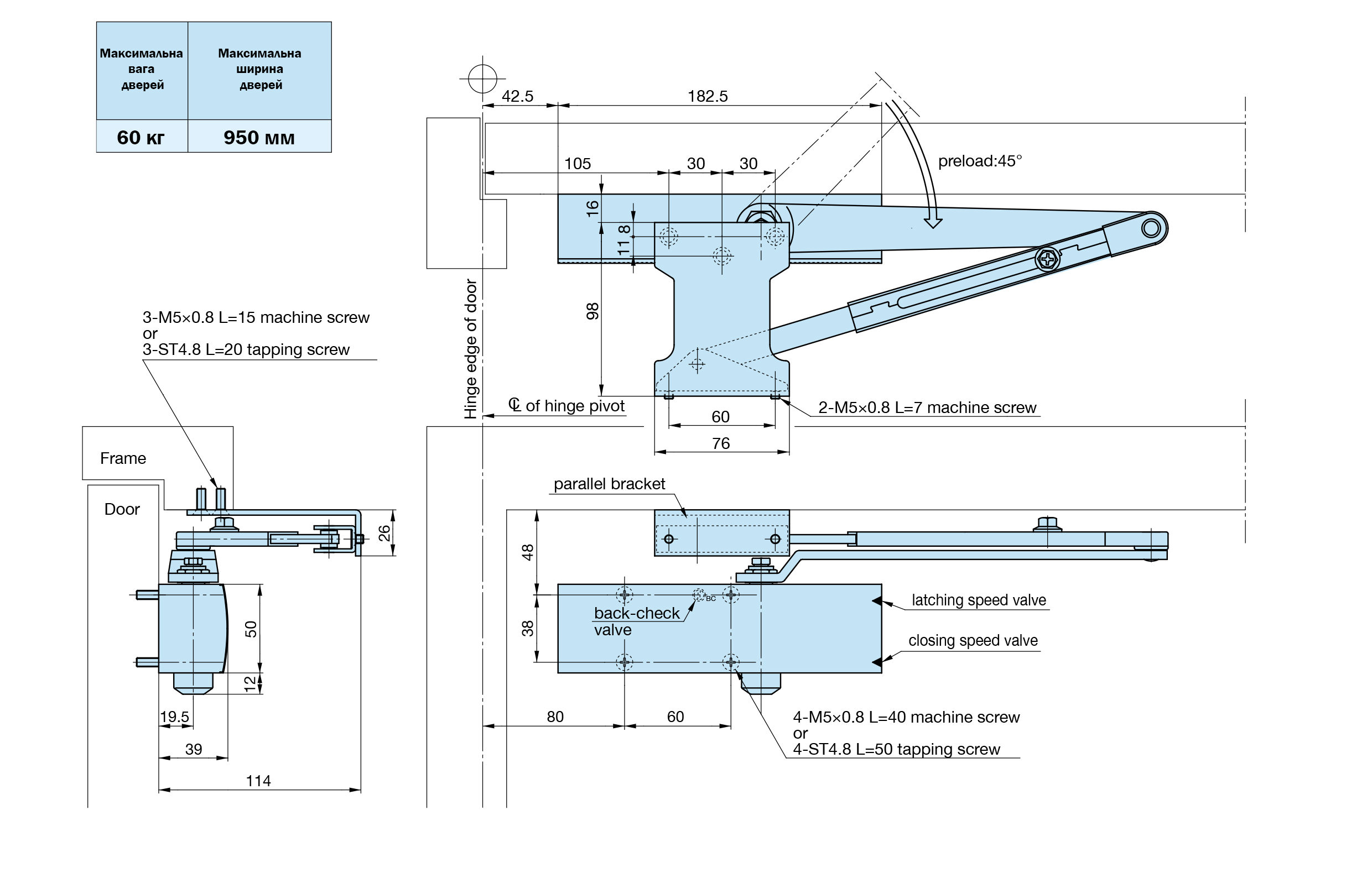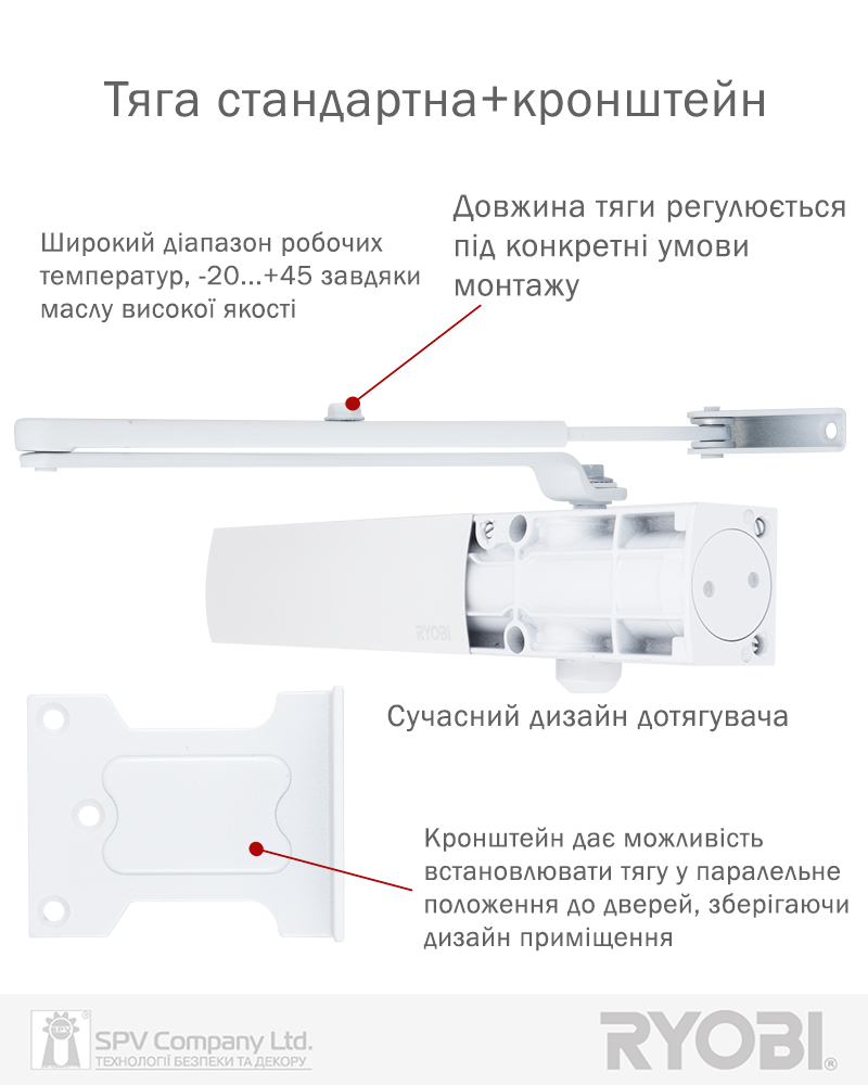 Комплектація: дотягувач, комплект кріплення, тяга стандартна, кронштейн паралельної тяги.