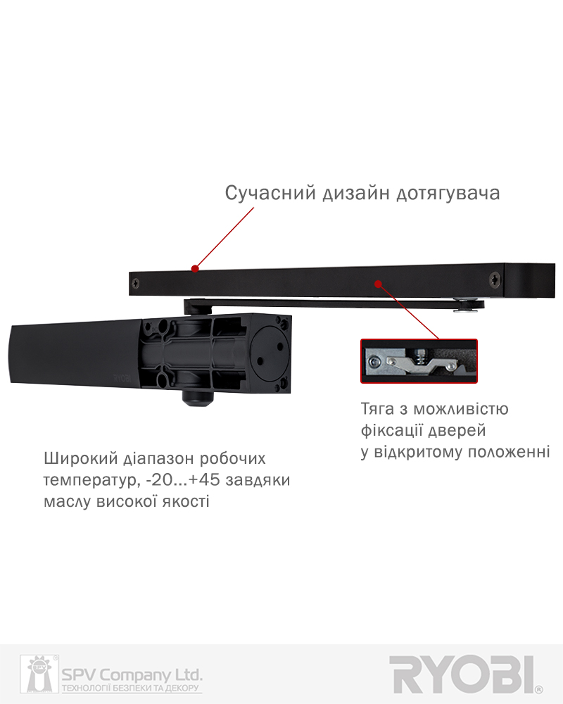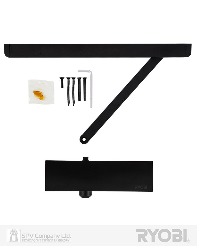 Дотягувач дверей RYOBI® серії 1200 модель D-1200T (Японія) накладного типу з ковзною тягою – призначений для керування внутрішніми та легкими зовнішніми дверима.