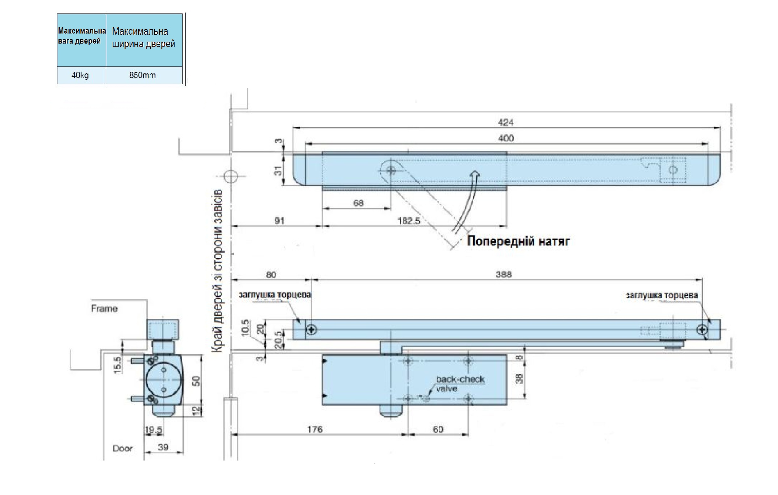 Максимальна вага дверей - 40кг,