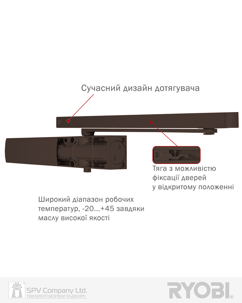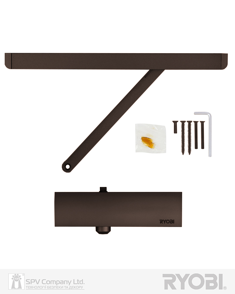 Дотягувач дверей RYOBI® серії 1200 модель D-1200T (Японія) накладного типу з ковзною тягою – призначений для керування внутрішніми та легкими зовнішніми дверима.