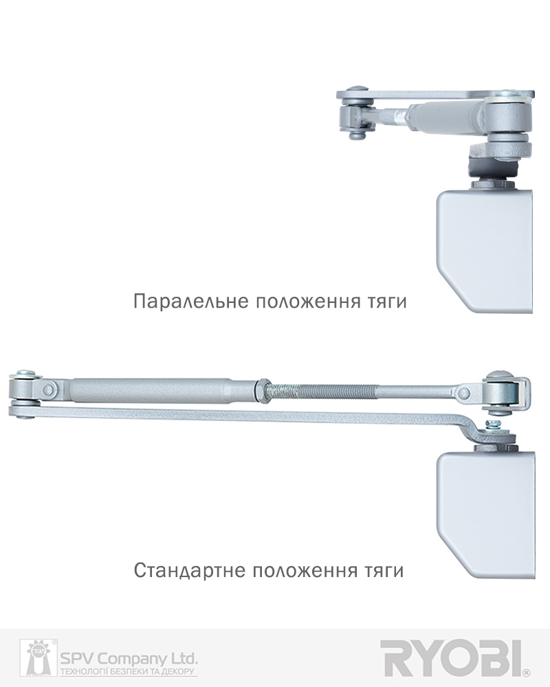 Стандартна тяга, т.з. «коліно», надає два варіанта встановлення дотягувача на дверях.