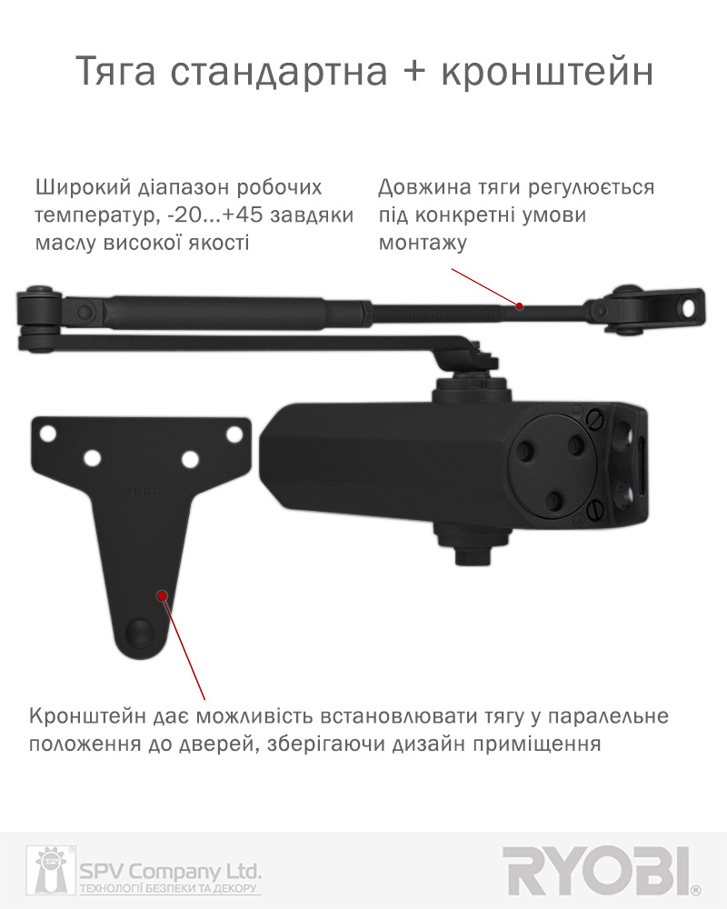 Комплектація: дотягувач, комплект кріплення, тяга стандартна, кронштейн паралельної тяги