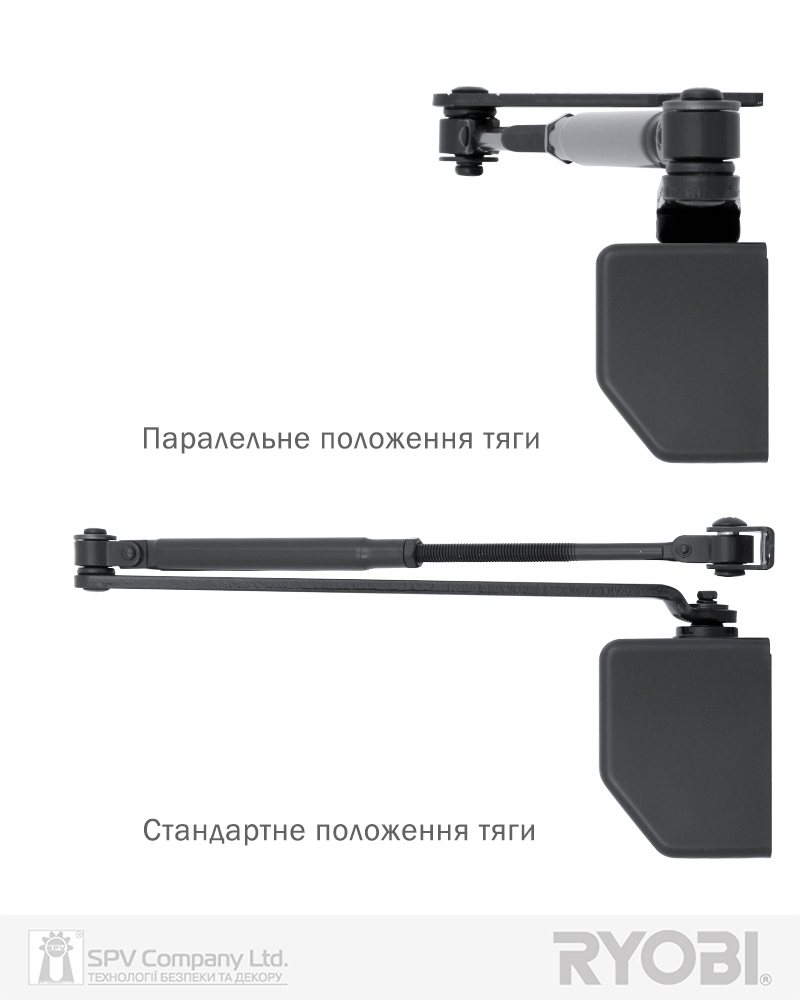 Комплектація: дотягувач, декоративна кришка, комплект кріплення, тяга стандартна, кронштейн паралельної тяги