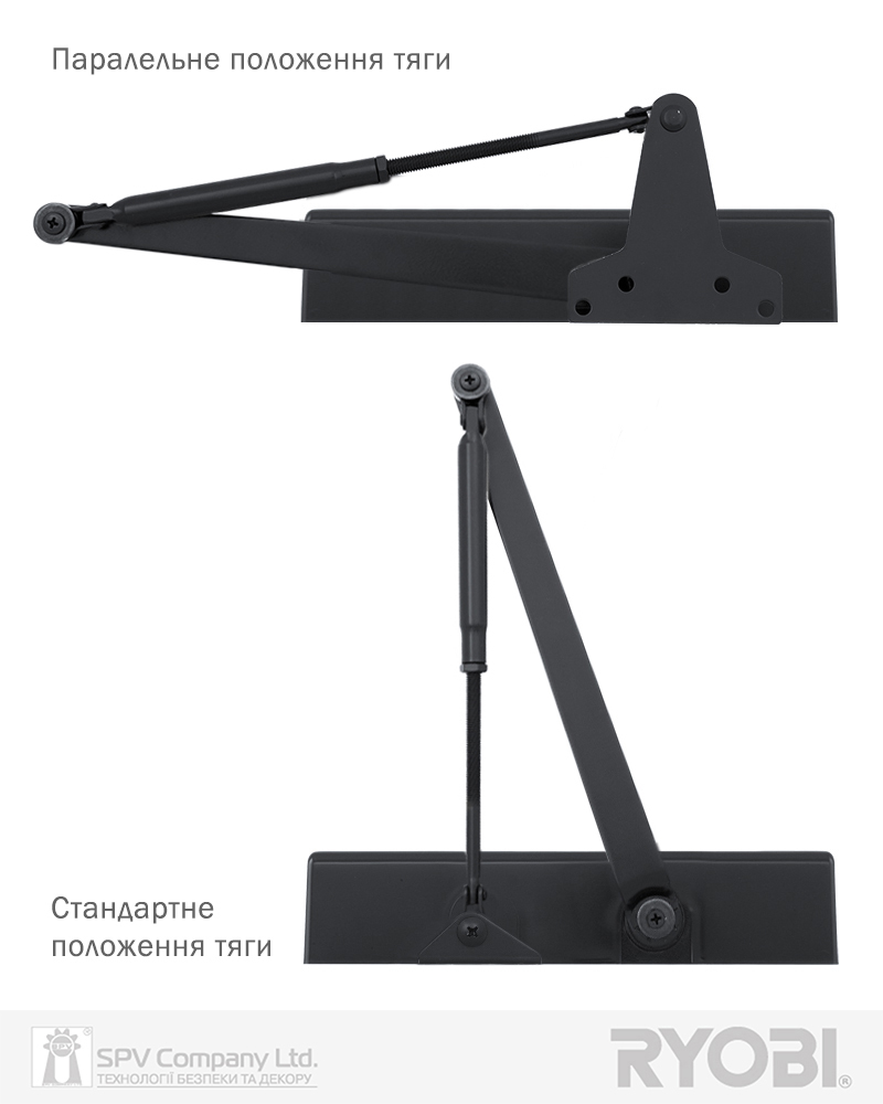 Комплектація: дотягувач, декоративна кришка, комплект кріплення, тяга стандартна, кронштейн паралельної тяги