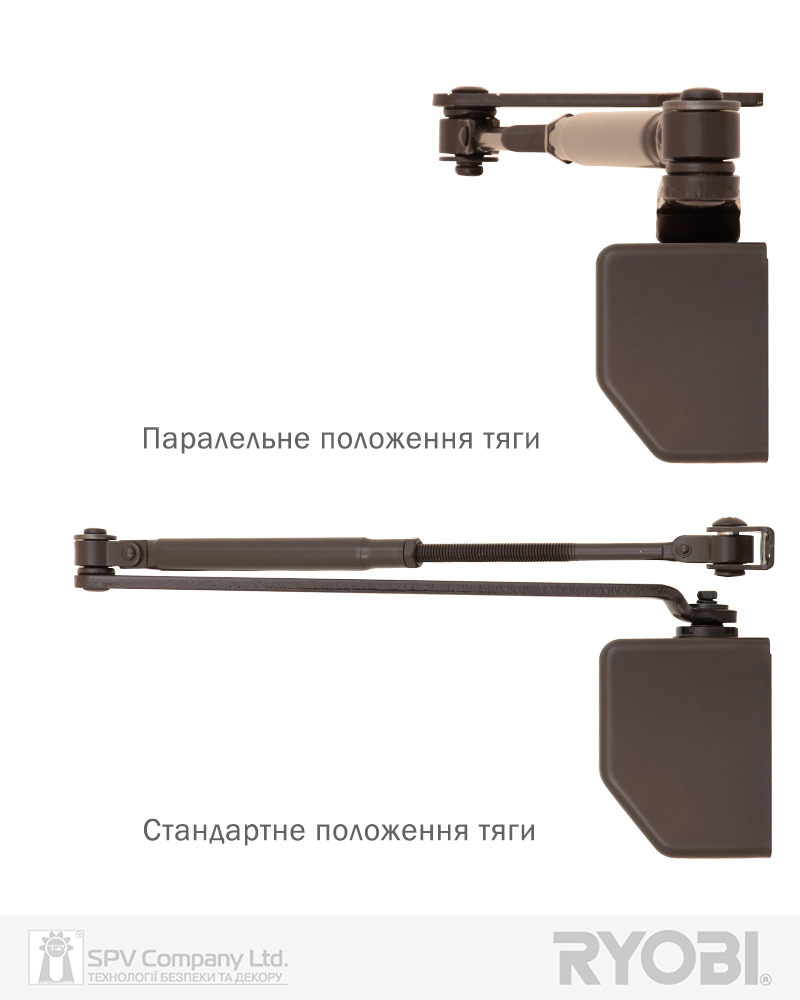 Стандартна тяга, т.з. «коліно», надає два варіанта встановлення дотягувача на дверях.