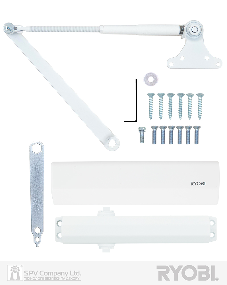 Комплектація: дотягувач, декоративна кришка, комплект кріплення, тяга паралельна з фіксацією видкритого положення дверей.