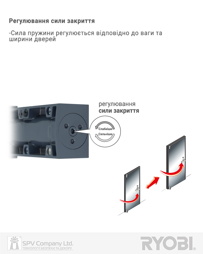Має регулювання натягу внутрішньої пружини (класу дотягувача), що дозволяє використовувати єдину модель дотягувача до різних класів дверей. Також полегшує регулювання сили закривання дотягувача, не змінюючи його положення на дверях.