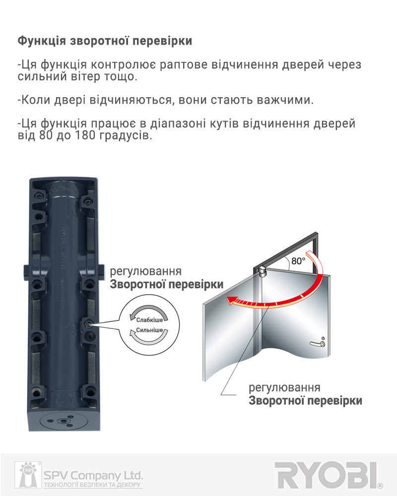 Стандартно має регульовану функцію BackCheck (вітрове гальмо), яка затримує відчинення дверей після кута 70-80°, що дозволяє уникнути пошкодження дверей, фурнітури, стін.
