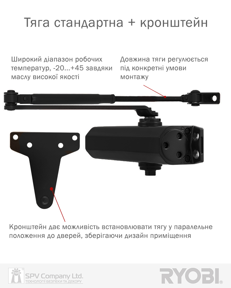 Комплектація: дотягувач, декоративна кришка, комплект кріплення, тяга стандартна, кронштейн паралельної тяги.