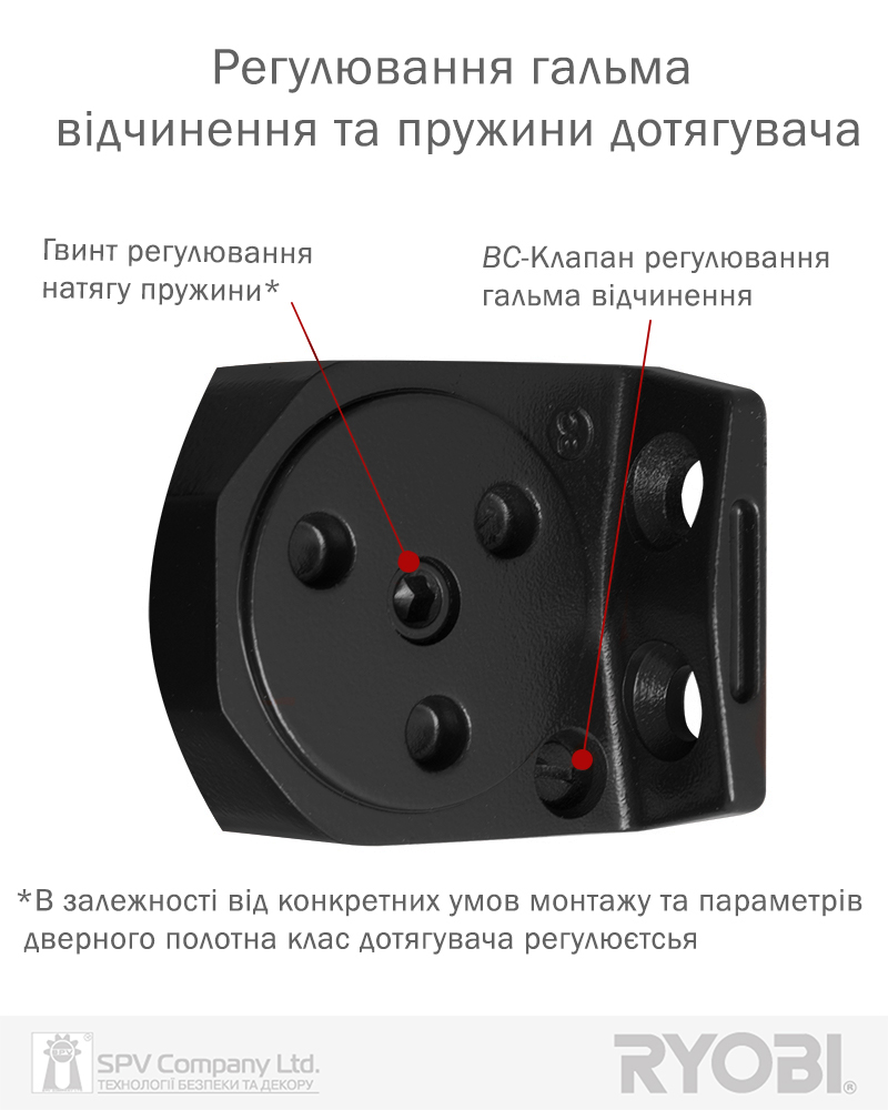 Має регулювання натягу внутрішньої пружини (класу дотягувача), що дозволяє використовувати єдину модель дотягувача до різних класів дверей. Також полегшує регулювання сили закривання дотягувача, не змінюючи його положення на дверях.