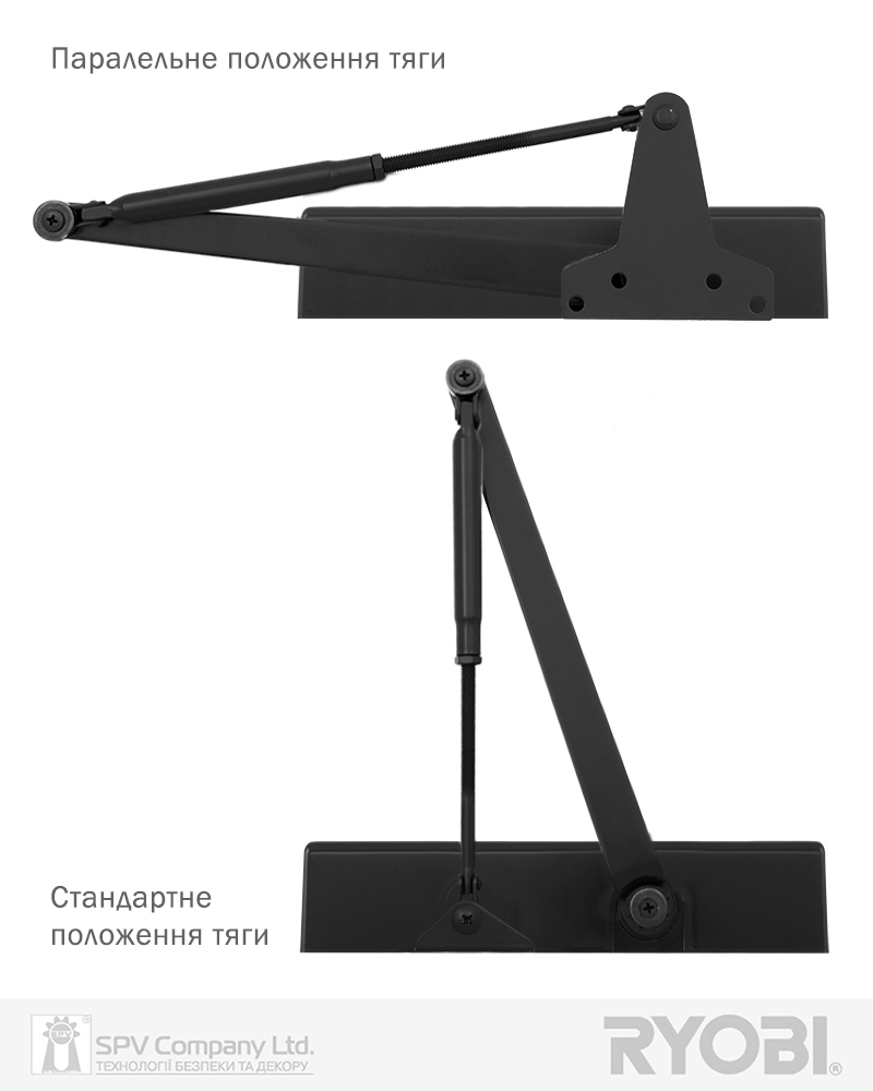Стандартна тяга, т.з. «коліно», надає два варіанта встановлення дотягувача на дверях.