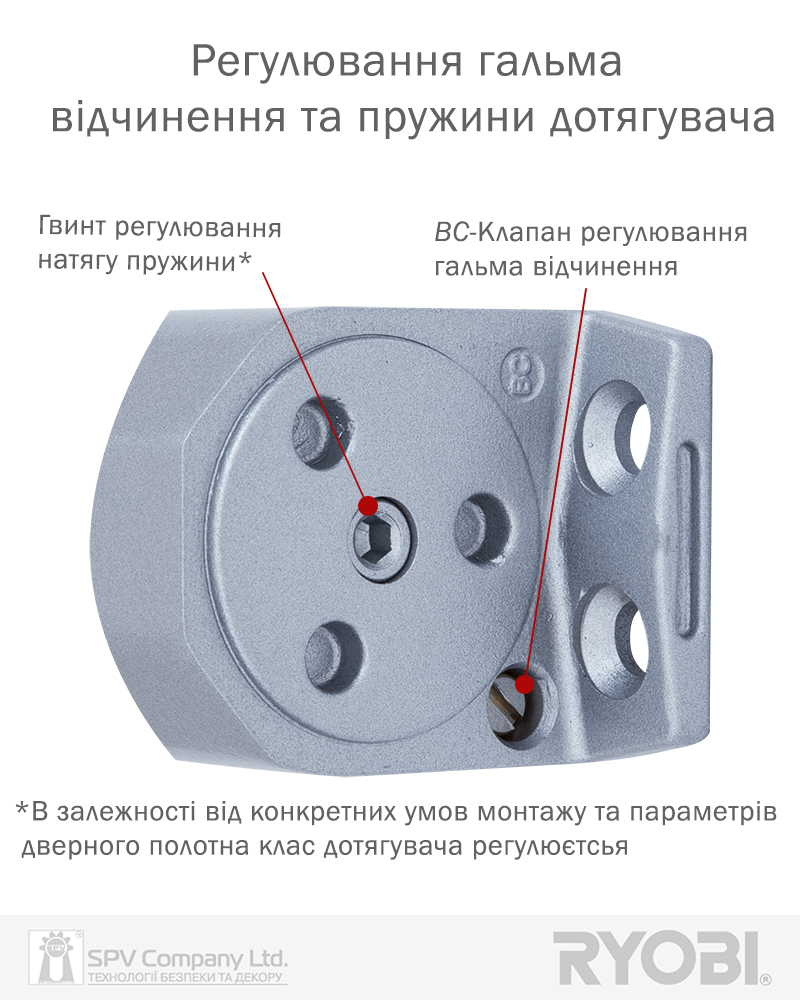 Має регулювання натягу внутрішньої пружини (класу дотягувача), що дозволяє використовувати єдину модель дотягувача до різних класів дверей. Також полегшує регулювання сили закривання дотягувача, не змінюючи його положення на дверях.