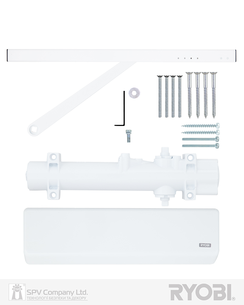 Комплектація: дотягувач, декоративна кришка, комплект кріплення, тяга ковзна, фіксатор відкритого положення дверей.