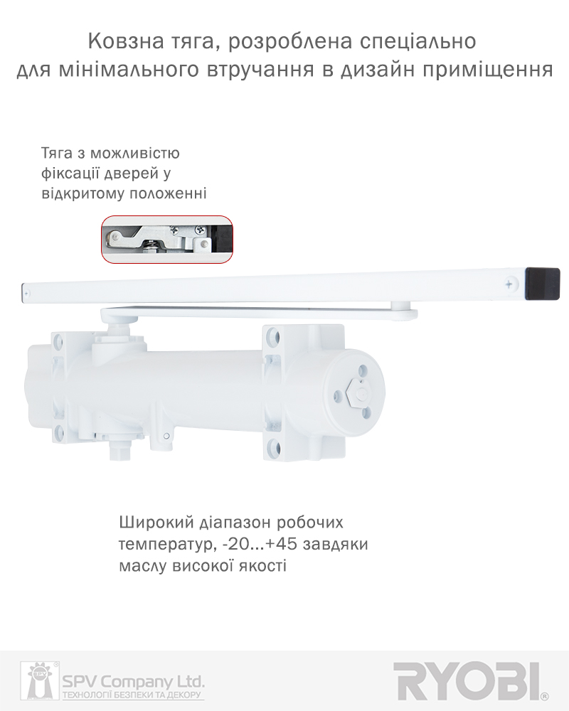 Дотягувач дверей RYOBI® серії 4550 модель DS-4550T BC SLD_HO (Японія) накладного типу з ковзною тягою – призначений для керування внутрішніми та зовнішніми дверима.