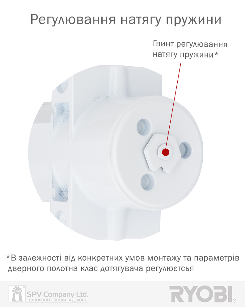 Має регулювання натягу внутрішньої пружини (класу дотягувача), що дозволяє використовувати єдину модель дотягувача до різних класів дверей. Також полегшує регулювання сили закривання дотягувача, не змінюючи його положення на дверях.