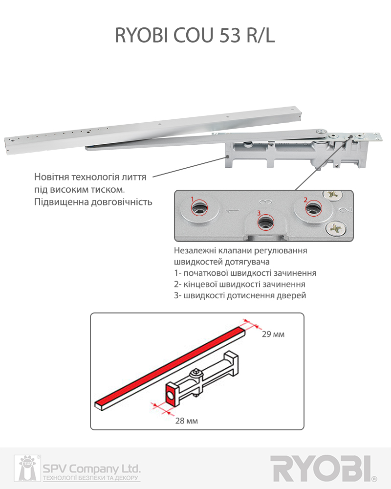 Дотягувач дверей RYOBI® серії COU модель COU-53_R (Японія) врізного типу – призначений для керування зовнішніми та внутрішніми дверима.