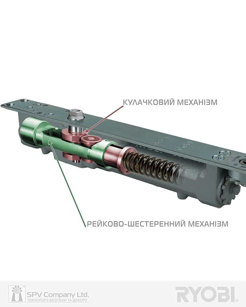 зачинення та менше зусилля при відчиненні дверей, гарний прихлоп та поліпшені регульовання швидкостей. Шестеренчасто-рейковий механізм забезпечує стабільну та точну швидкість зачинення.