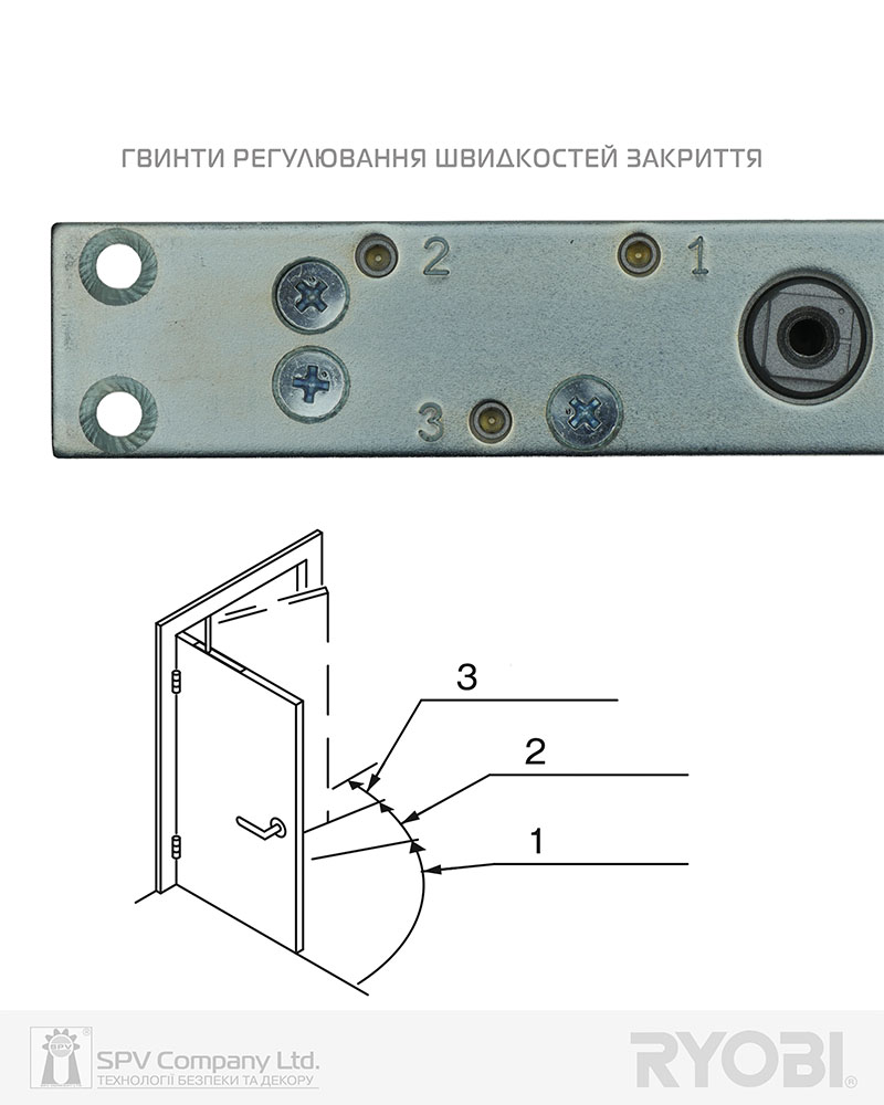 Регулювання початкової, кінцевої швидкостей зачинення, та швидкості прихлопу дверей.