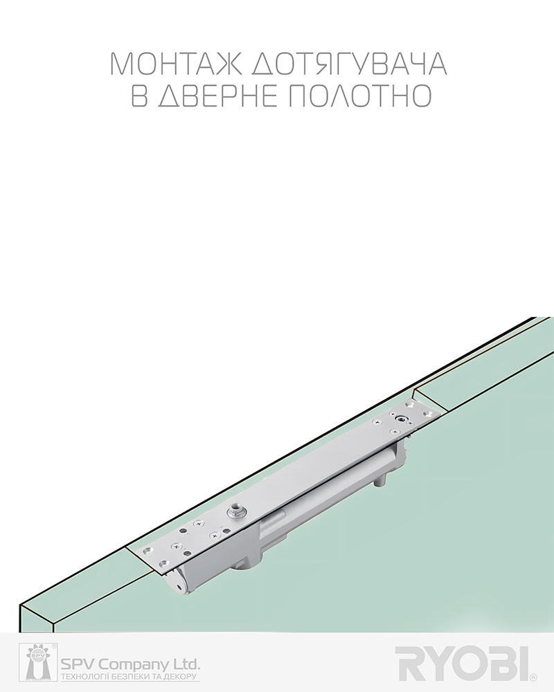 Ця модель врізна, корпус дотягувача встановлюється або в дверну стулку, або в дверну раму на праві двері (з боку відчинення дверей - завіси праворуч).