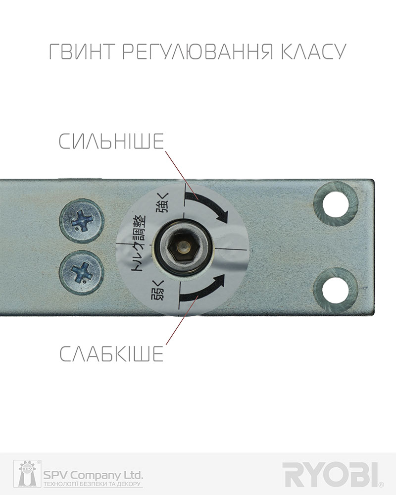 Має регулювання натягу внутрішньої пружини (класу дотягувача), що дозволяє використовувати єдину модель дотягувача до різних класів дверей. Також полегшує регулювання сили закривання дотягувача, не змінюючи його положення на дверях.