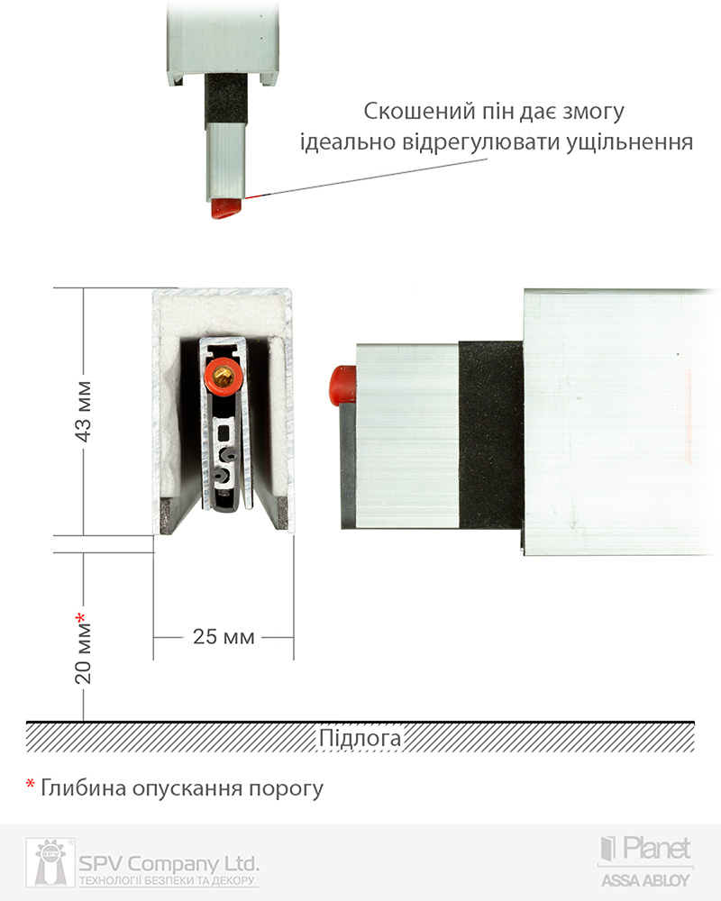 Пін – активатор (синього кольору) опускання ущільнювача спеціальної скошеної форми. Завдяки цьому спрацювання ущільнювача відбувається в останній момент закривання дверей, на 5°-10°, ущільнювач менше зношується.
