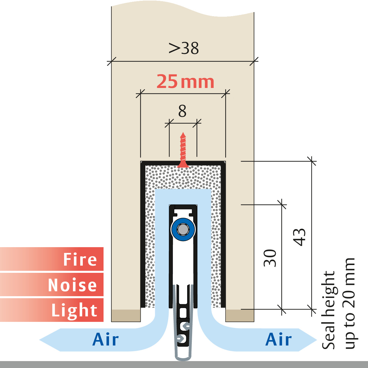 Поріг висувний для дерев'яних дверей с чвертю, розташованих в приміщеннях з рівною поверхнею підлоги. Тихе, рівномірне паралельне опускання з автоматичною компенсацією ухилу підлоги. Можливе використання на металевих дверях.