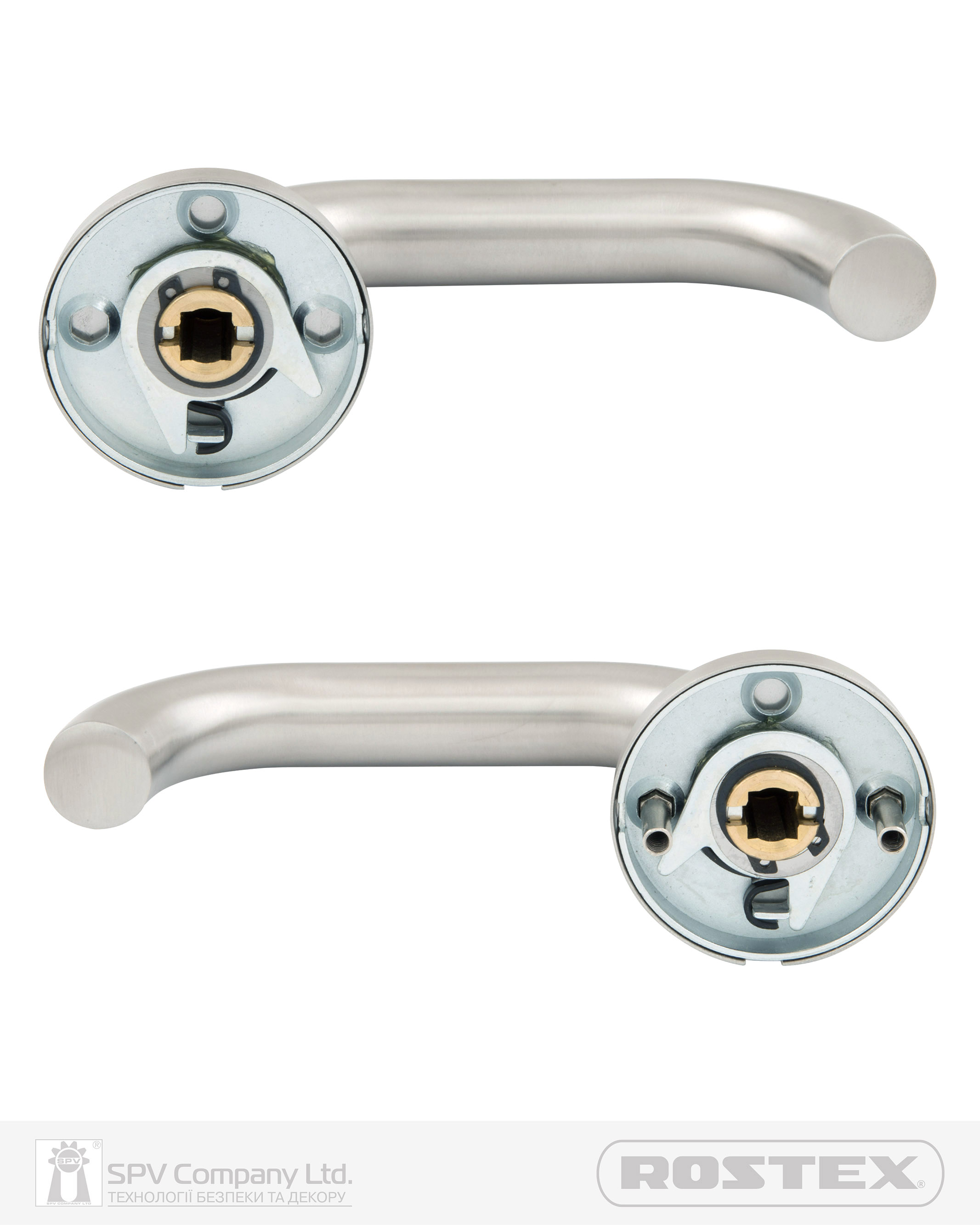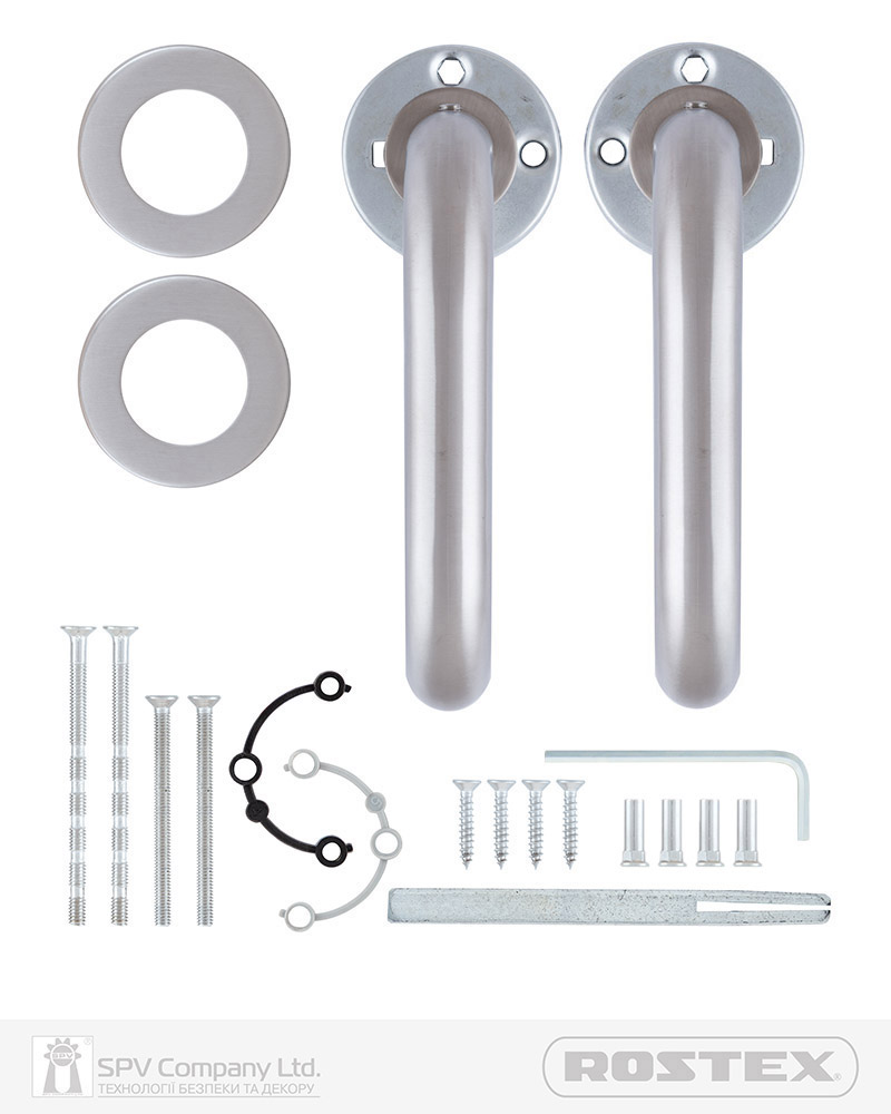 Підходить для дверей завтовшки 38-52 мм. Має якісну поворотну пружину, що розрахована на велике експлуатаційне навантаження. Європейський стандарт дверних ручок - EN 1906. В комплекті: шток – 8х8 мм, саморізи для кріплення безпосередньо до полотна дверей та болти М4 для наскрізного кріплення з заглушками. Болти можна вкорочувати в залежності від товщини дверей. Відстань між болтами 38 мм. Такий набір дозволяє кріпити ручку, як до полотна дверей, так і наскрізними гвинтами (якщо у замку є отвори), в залежності від вашого вибору. Кріплення з нержавіючої сталі. Пластикові вставки використовують, якщо ручка монтується наскрізними гвинтами. Вони виконують роль прихованого спейсера і запобігають тертю щитка ручки по полотну дверей. В комплекті дві пластикові вставки: номер «5» для зовнішньої сторони та номер «4» для внутрішньої.