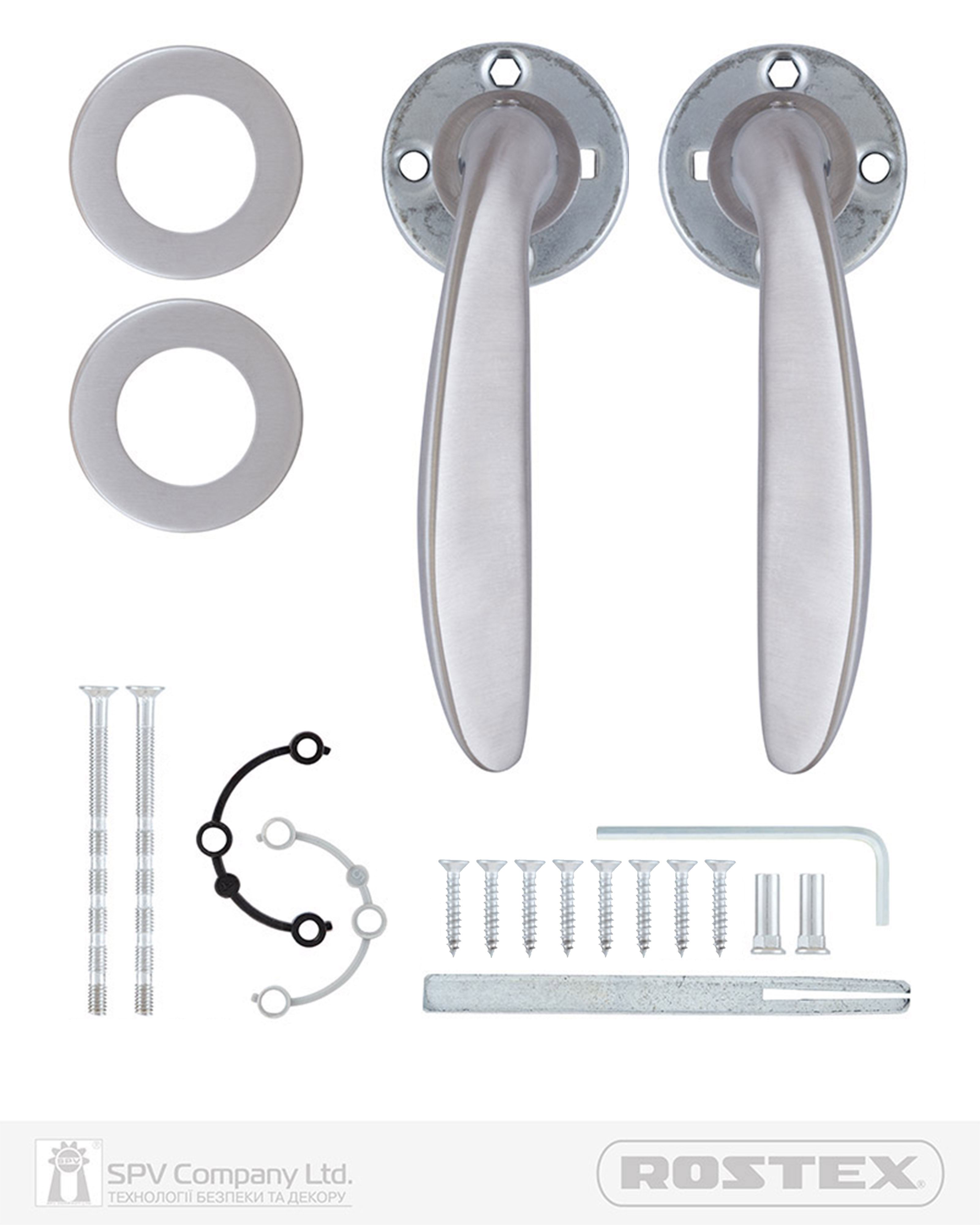 Підходить для дверей завтовшки 38-52 мм. Має якісну поворотну пружину, що розрахована на велике експлуатаційне навантаження. Європейський стандарт дверних ручок - EN 1906. В комплекті: шток – 8х8 мм, саморізи для кріплення безпосередньо до полотна дверей та болти М4 для наскрізного кріплення з заглушками. Болти можна вкорочувати в залежності від товщини дверей. Відстань між болтами 38 мм. Такий набір дозволяє кріпити ручку, як до полотна дверей, так і наскрізними гвинтами (якщо у замку є отвори), в залежності від вашого вибору. Кріплення з нержавіючої сталі. Пластикові вставки використовують, якщо ручка монтується наскрізними гвинтами. Вони виконують роль прихованого спейсера і запобігають тертю щитка ручки по полотну дверей. В комплекті дві пластикові вставки: номер «5» для зовнішньої сторони та номер «4» для внутрішньої.