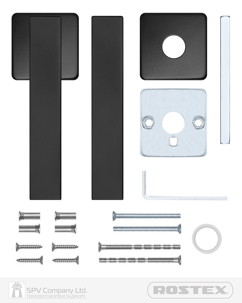 Відстань між гвинтами 38 мм. Такий набір дозволяє кріпити ручку крізь двері, якщо у замку є отвори.