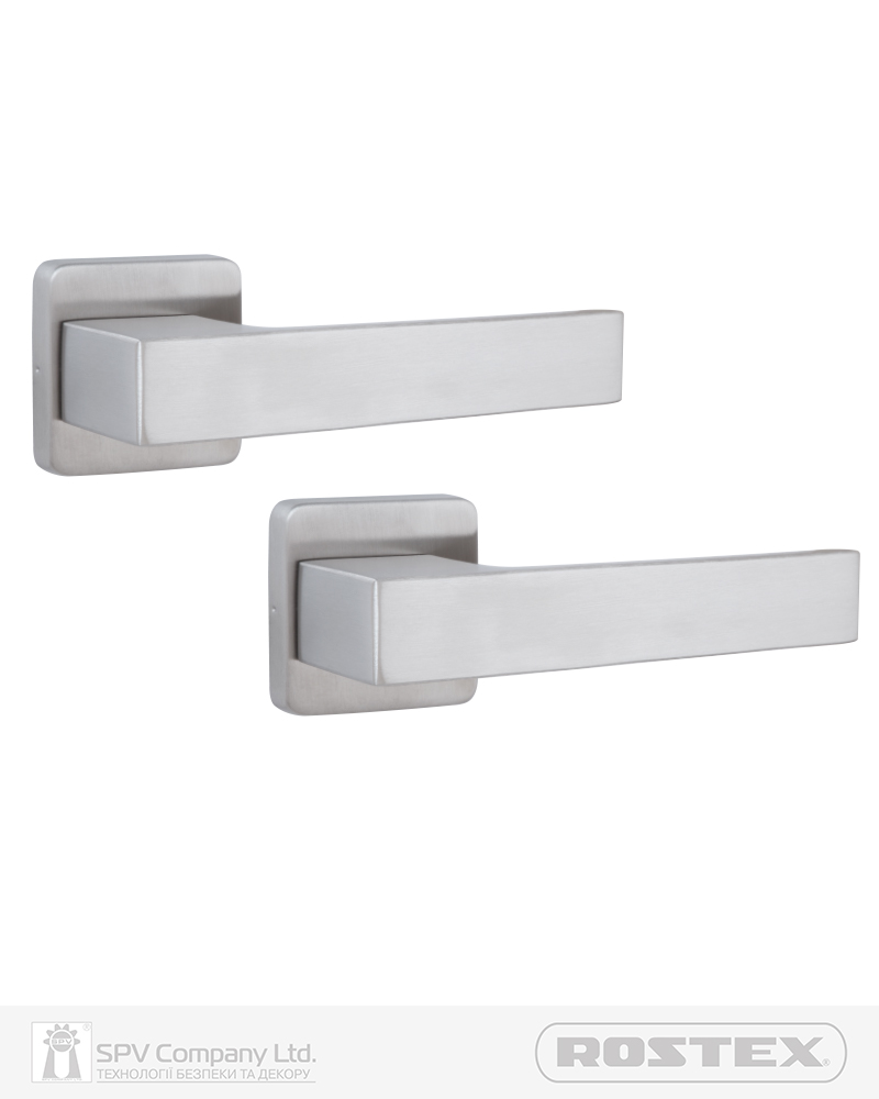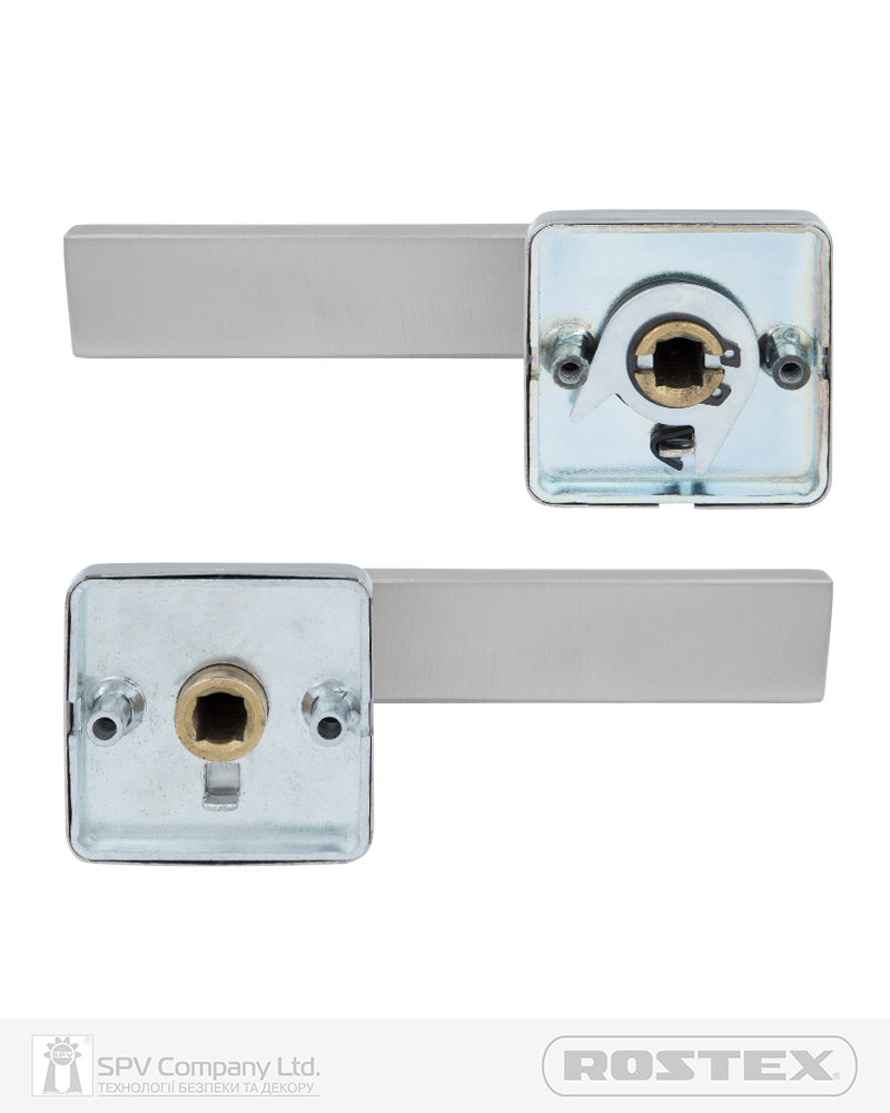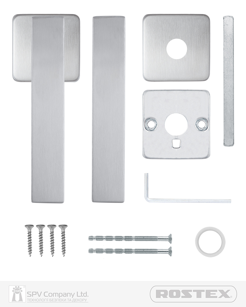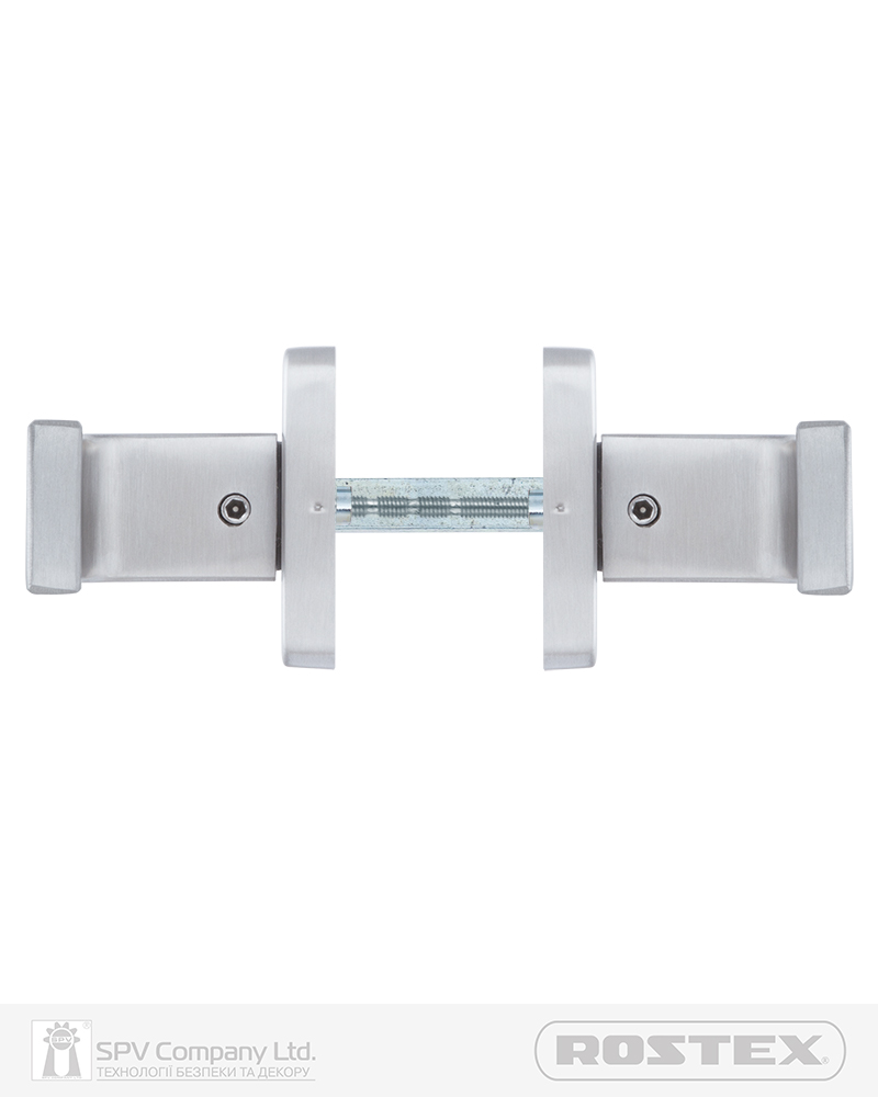 Підходить для дверей завтовшки 38-52 мм. Має якісну поворотну пружину, що розрахована на велике експлуатаційне навантаження та посилену конструкцію з фіксуючими металевими елементами. Європейський стандарт дверних ручок - EN 1906. В комплекті: шток – 8х8 мм, болти М4 для наскрізного кріплення з заглушками. Болти можна вкорочувати в залежності від товщини дверей. Відстань між болтами 38 мм. Такий набір дозволяє кріпити ручку наскрізними гвинтами , якщо у замку є отвори. Кріплення з нержавіючої сталі.
