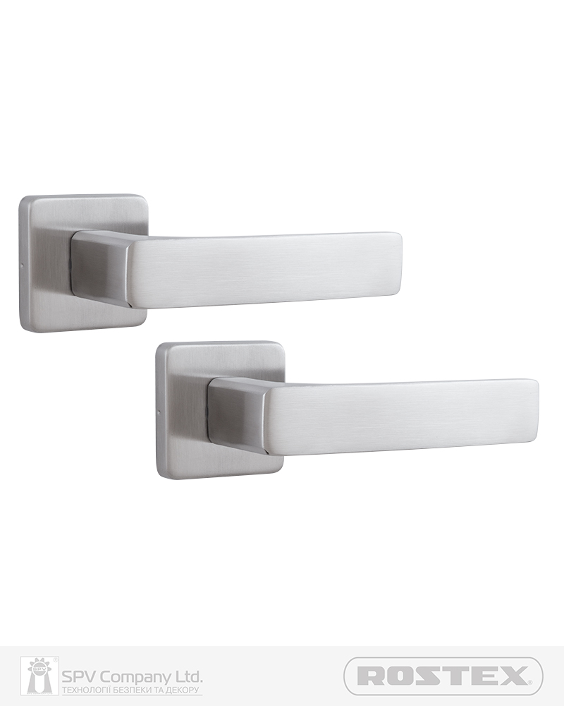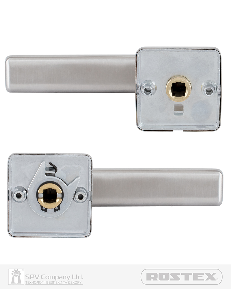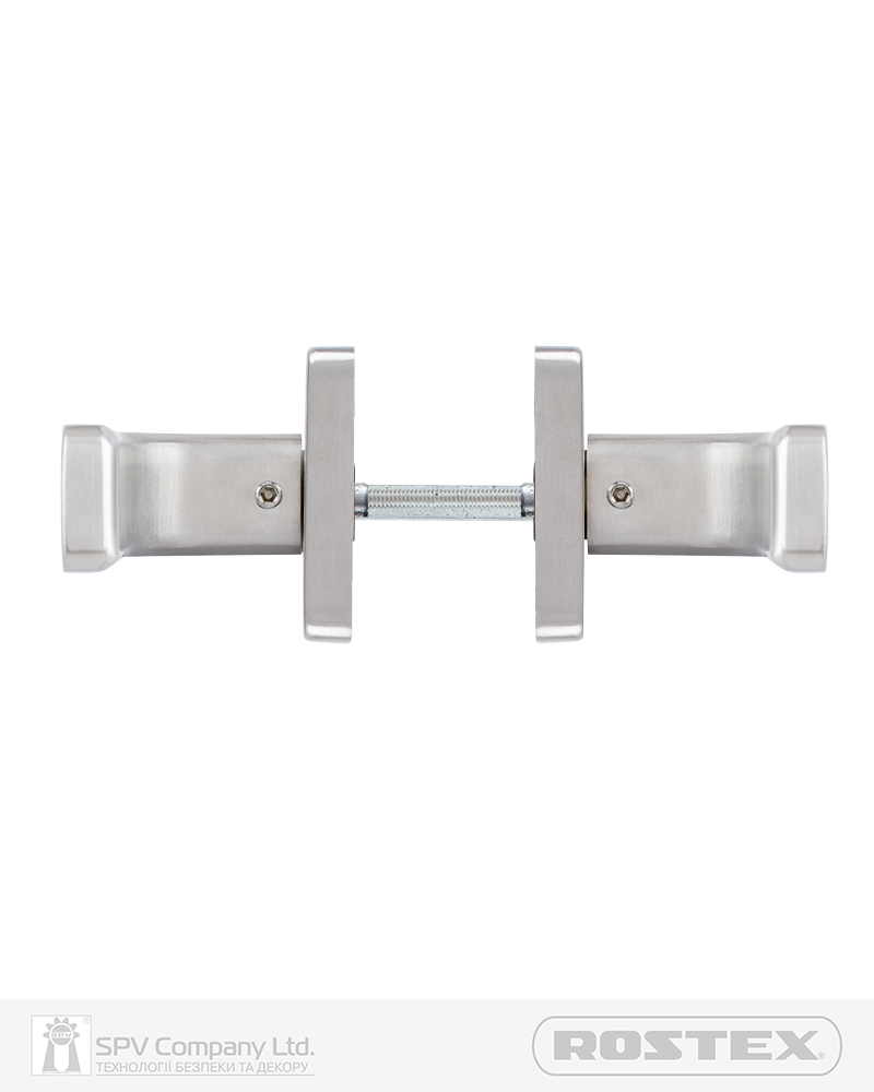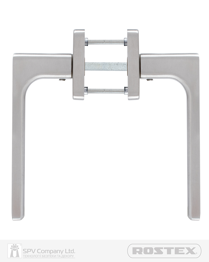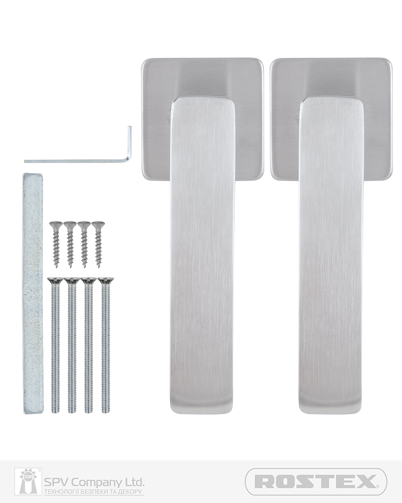 Підходить для дверей завтовшки 38-52 мм. Має якісну поворотну пружину, що розрахована на велике експлуатаційне навантаження та посилену конструкцію з фіксуючими металевими елементами. Європейський стандарт дверних ручок - EN 1906. В комплекті: шток – 8х8 мм, болти М4 для наскрізного кріплення з заглушками. Болти можна вкорочувати в залежності від товщини дверей. Відстань між болтами 38 мм. Такий набір дозволяє кріпити ручку наскрізними гвинтами , якщо у замку є отвори. Кріплення з нержавіючої сталі.