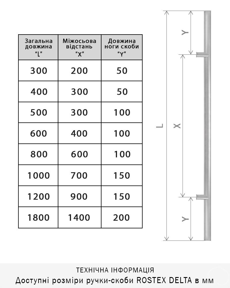 В нашому асортименті є різні довжини ручок-скоб, доступні розміри для моделі ROSTEX DELTA: 300, 400, 500, 600, 800, 1000, 1200, 1800 мм.