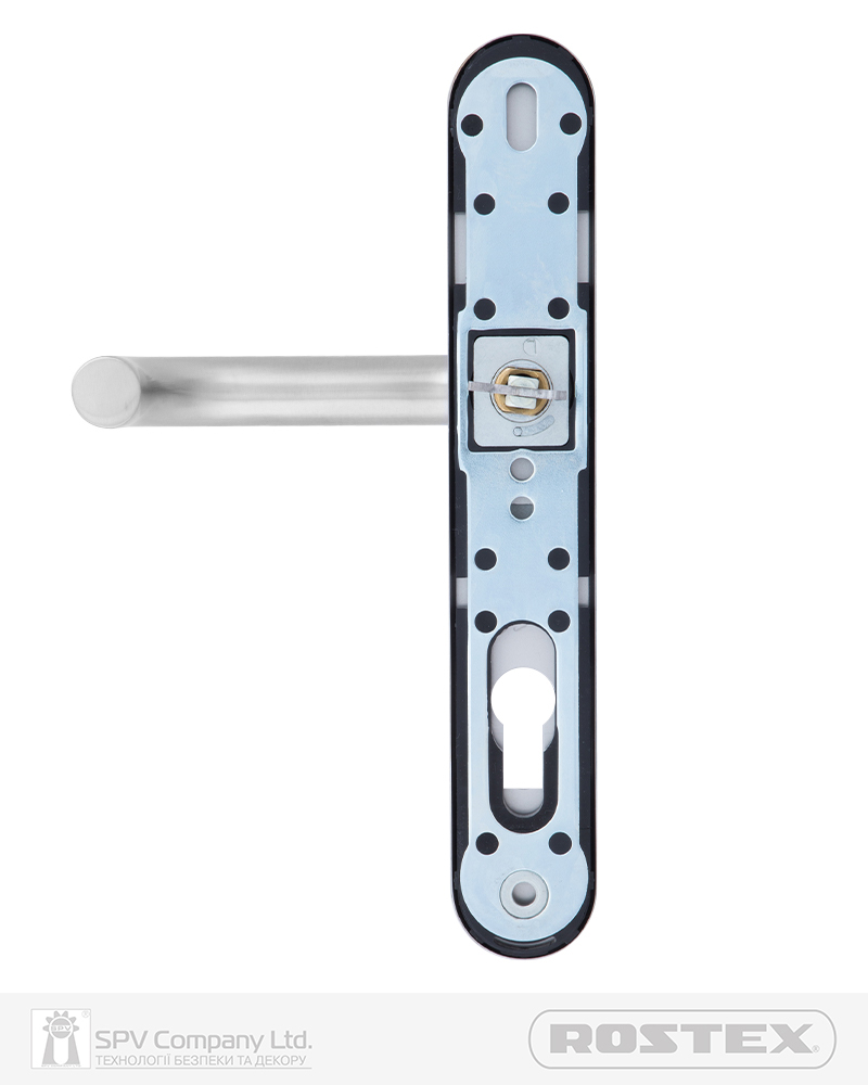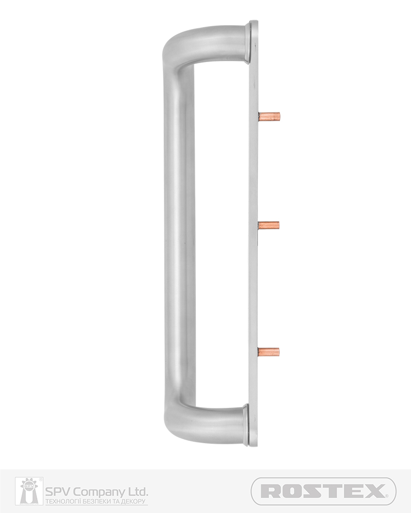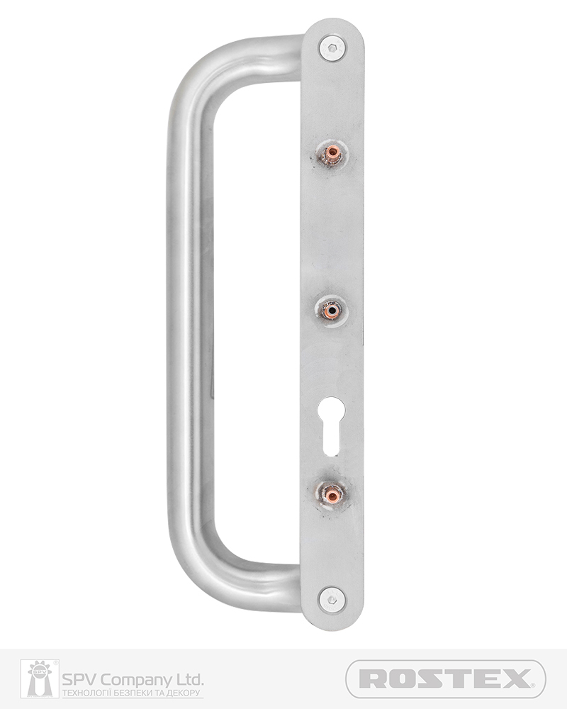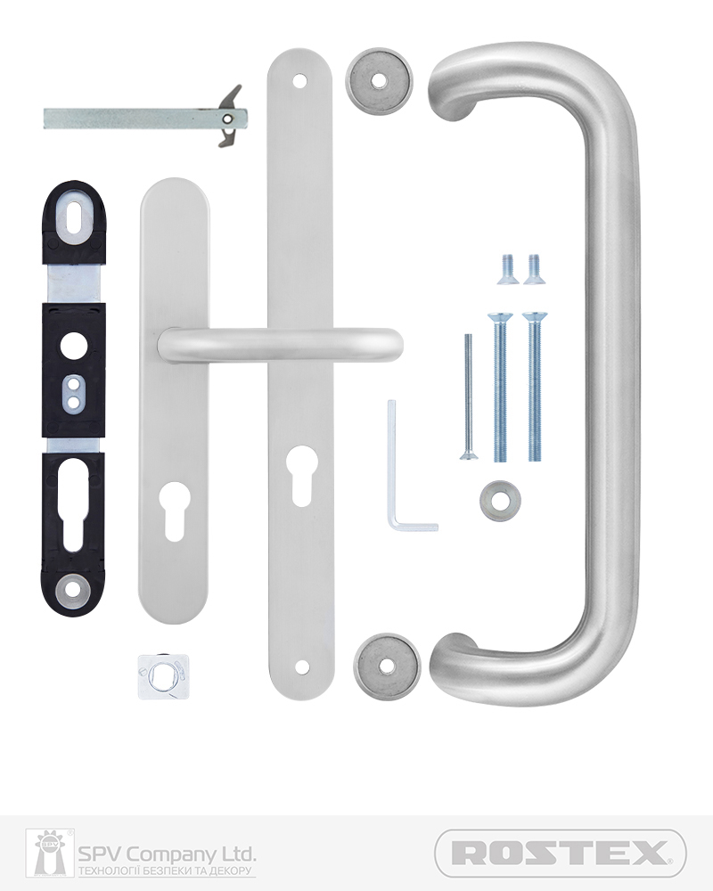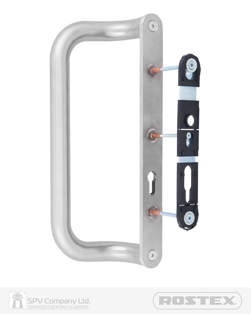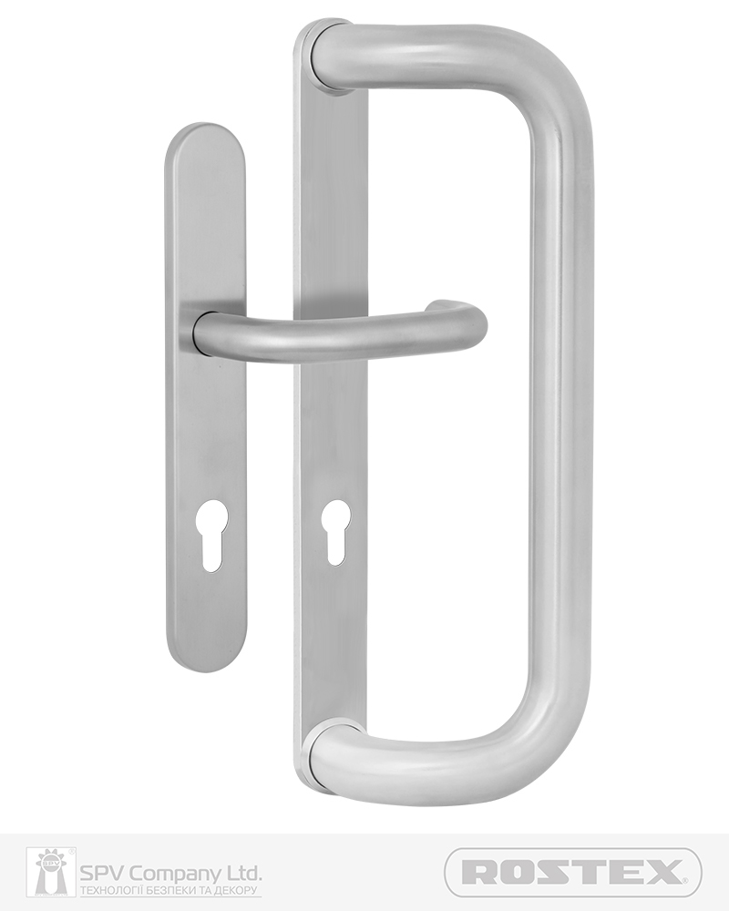 Ручка-скоба ззовні та нажимна ручка зсередини на шилді з нержавіючої сталі, призначена для профільних дверей, особливо пвдходить для вхідних дверей у багатоквартирні будинки, з метою використання з системою контроля доступа. Забеспечує контрольований вхід ззовні та вільний вихід зсередини.
