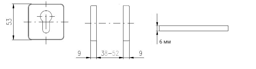 Для дверей товщиною 38-45 мм. Щиток квадратної форми - 53 х 53 мм. Квадрат - 6 мм.