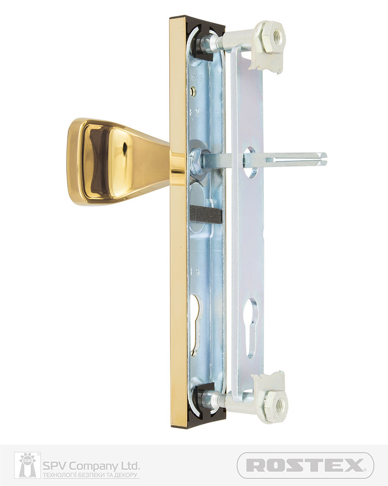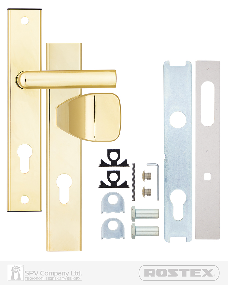 Фурнітура захисна ROSTEX 802 до основних замків для вхідних металевих, деревяних та профільних дверей товщиною 38-55мм з можливістю подовження до 100мм (комплекти подовження замовляються окремо). З-й клас безпеки. Матеріал: нержавіюча сталь, замак. Плата, що захищає корпус замка. Кріплення - болти М8.