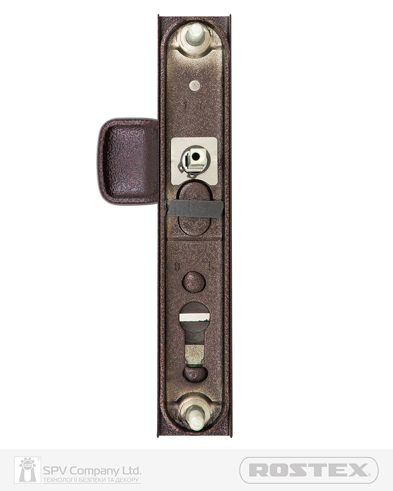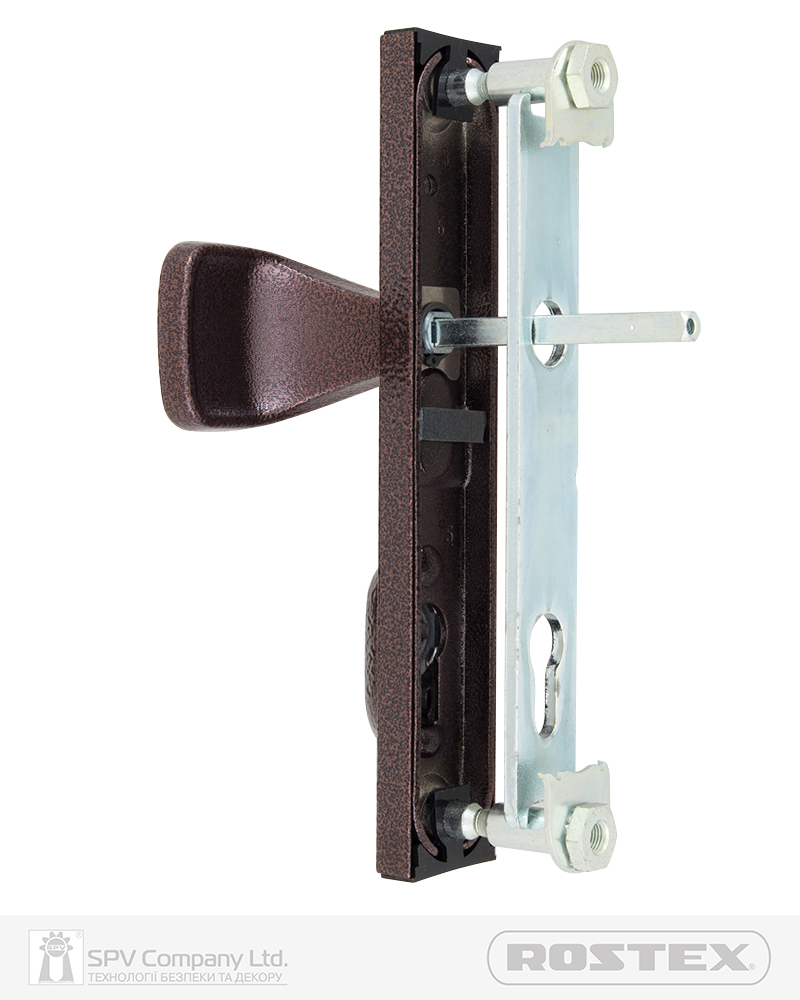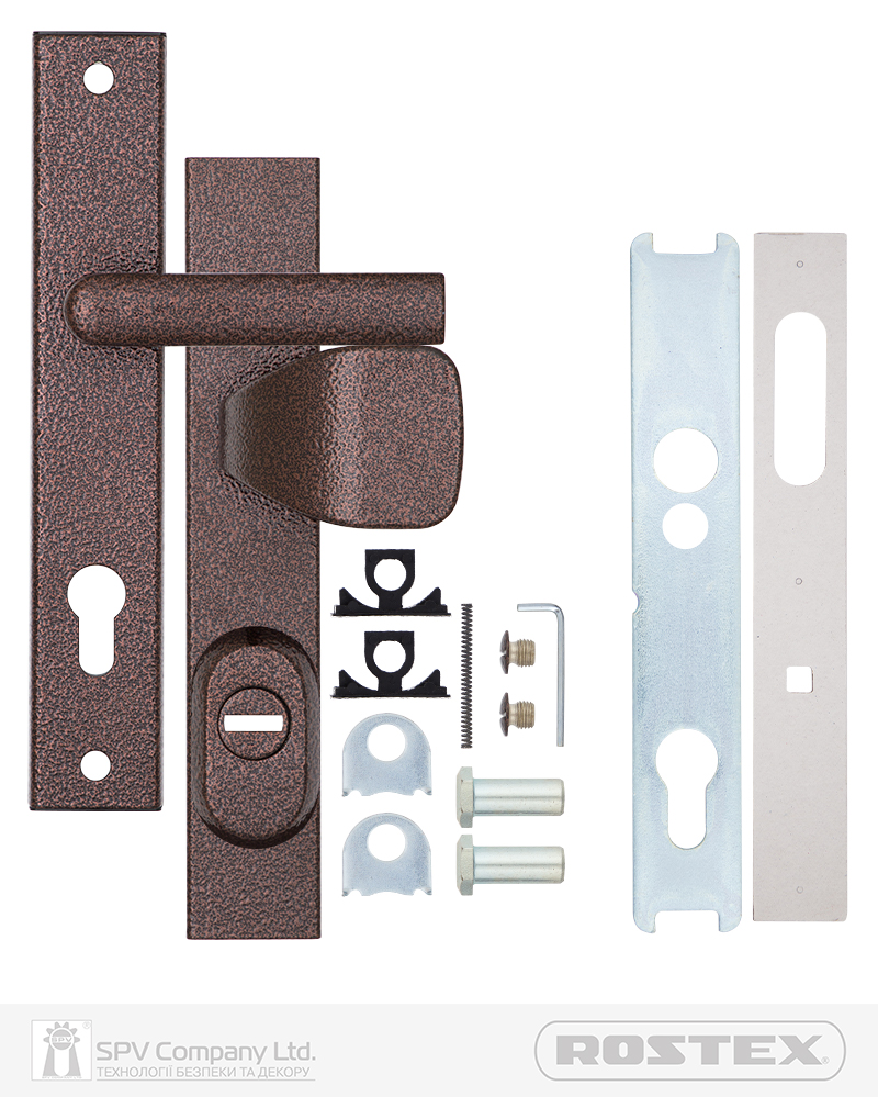 Фурнітура захисна ROSTEX R1 до основних замків для вхідних металевих, деревяних та профільних дверей товщиною 40-45мм з можливістю подовження до 100мм (комплекти подовження замовляються окремо). З-й клас безпеки. Матеріал: нержавіюча сталь, замак. Плата, що захищає корпус замка. Загартований протектор циліндра із захистом від висвердлювання. Кріплення - болти М8.