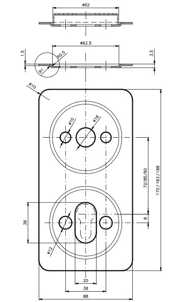 Ремонтна дверна пластина ROSTEX для фурнітури Quadrum. Міжосьова відстань: 72 мм. Матеріал: нержавіюча сталь.