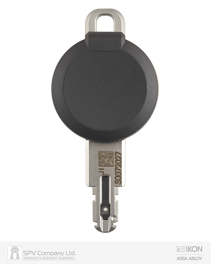 - Передача даних та живлення до циліндра здійснюється за допомогою безпосереднього контакту при вставленні ключа від батарейки яка встановлена в головці ключа