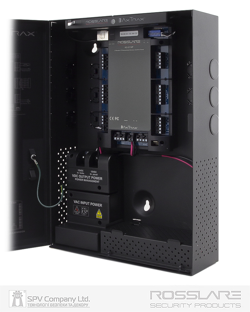 - Інтегрований блок живлення (12 В постійного струму 4А) для власних потреб, а також для зчитувачів (максимальний струм 300 мА для кожного) та електричних замків (максимальний струм 3 А)