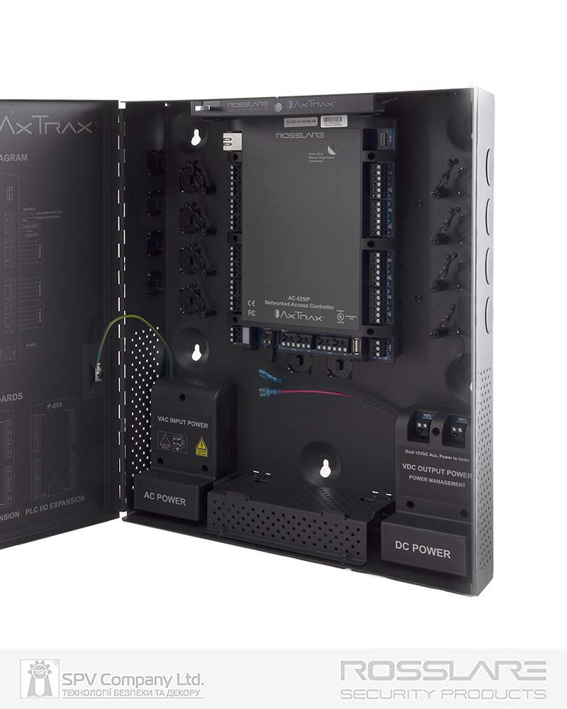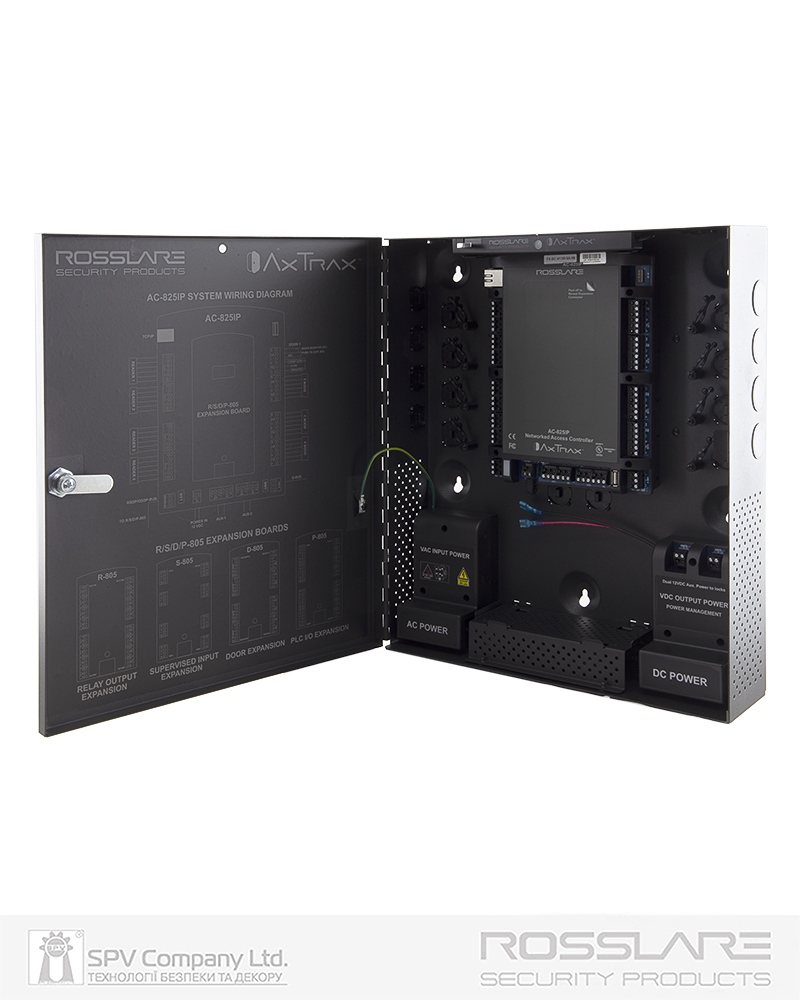 AC-825IP має зашифрований зв'язок через TCP/IP із сервером AxTraxNG і додаткову шину RS-485 для підключення плат розширення ROSSLARE через OSDP.