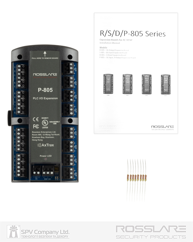 Одна плата розширення P-805 має на борту 16 контрольованих електричних входів та 8 реле. Це дозволяє підключити до контролеру AC-825IP 16 електрічних механізмів моніторінгу стану об'єкта (наприклад, кнопки виходу, сигнали спрацювання інших приладів або датчики стану дверей/вікон, руху, диму тощо), а також керувати 8 виконавчими механизмами СКД (замки, ригелі, защіпки, магніти) або електричними входами на інші пристрої (наприклад, сигналізації) й керувати ними або логикою складного приладу, наприклад, кнопками поверхів ліфту висотної будівлі.